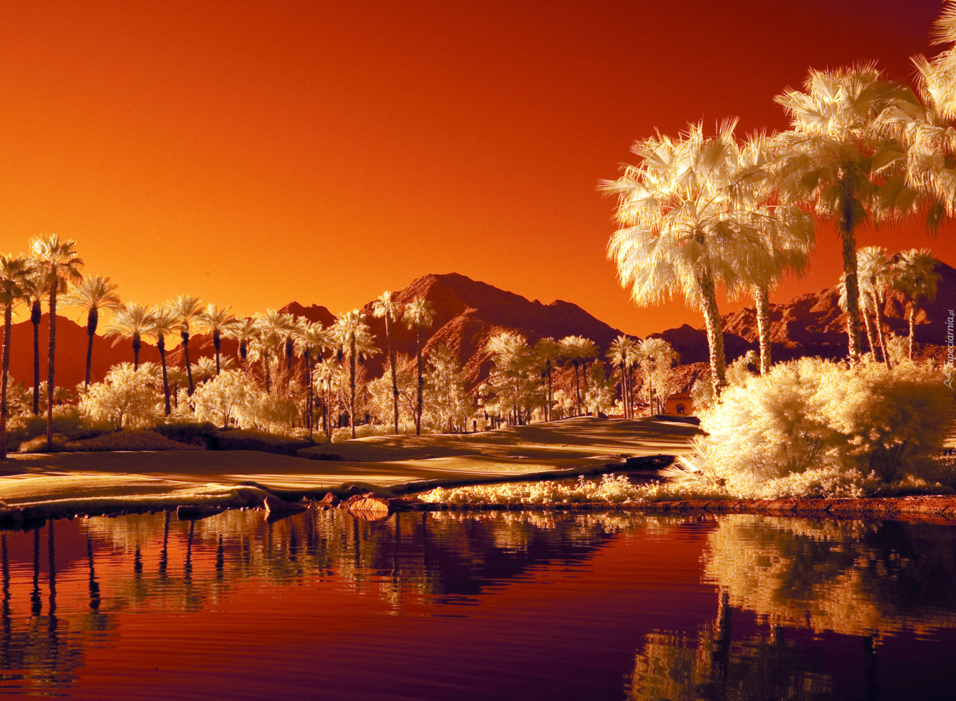 Edytor tapety: Zachód, Słońca, Góry, Jezioro, Białe, Palmy, Odbicie