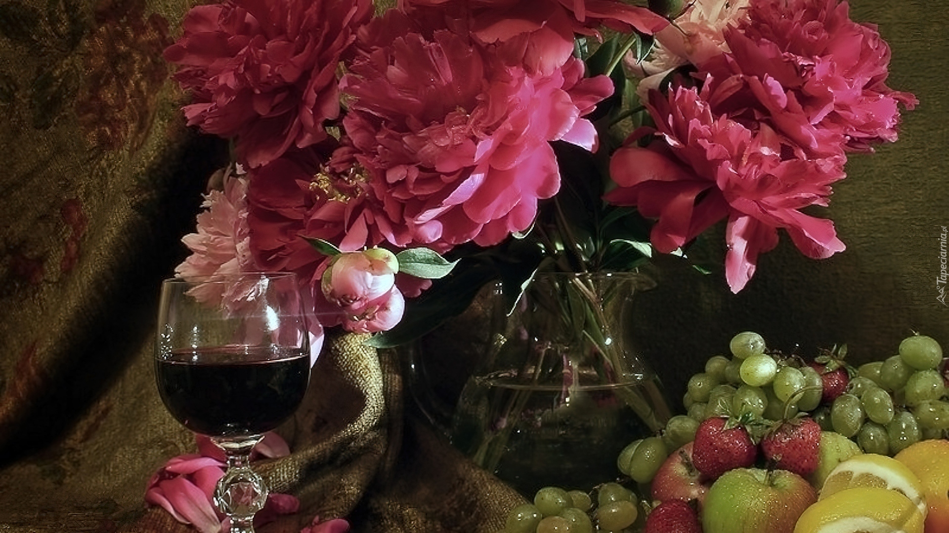 Edytor tapety: Piwonie, Owoce, Wino
