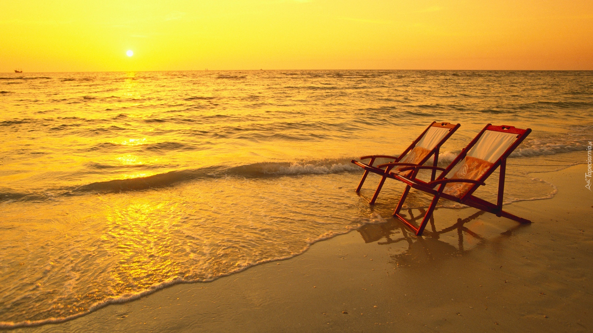 Edytor tapety: Morze, Plaża, Zachód, Słońca, Dwa, Leżaki, Wakacje