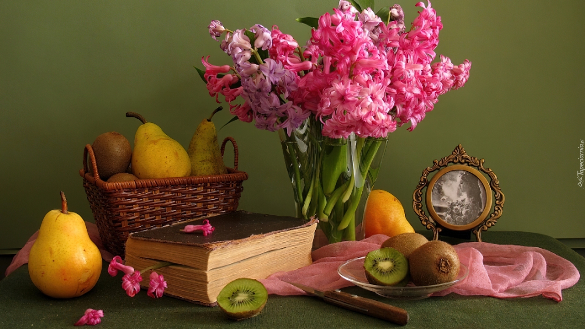 Edytor tapety: Hiacynty, Owoce, Książki