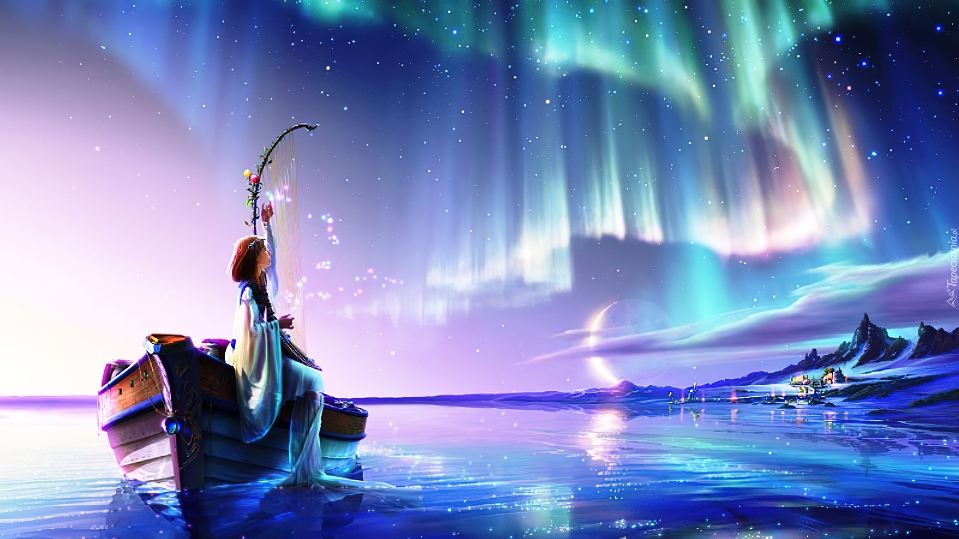 Edytor tapety: Dziewczyna, Harfa, Łódka, Woda, Grafika