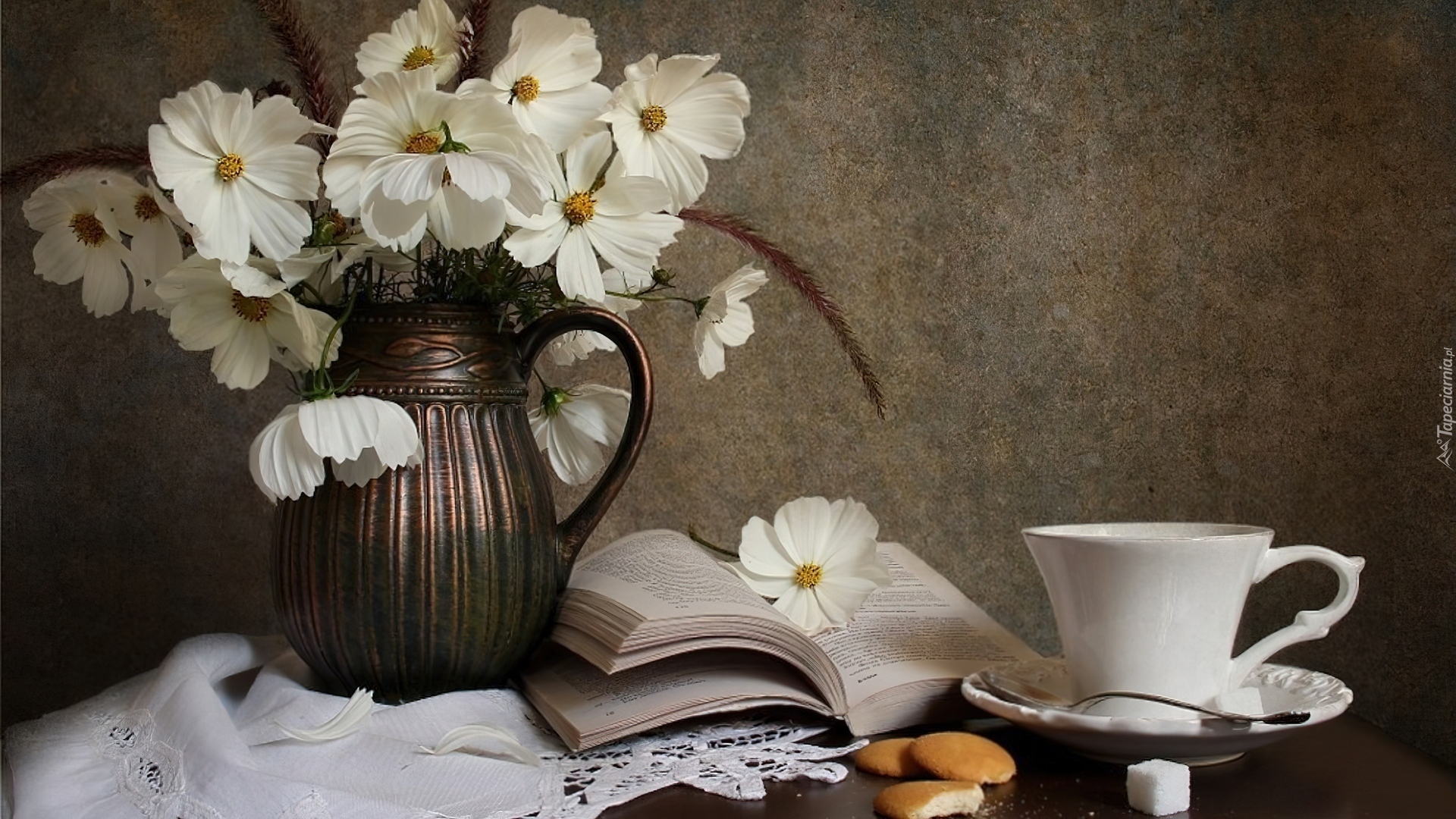 Edytor tapety: Biała, Kosmea, Flakon, Książka, Filiżanka