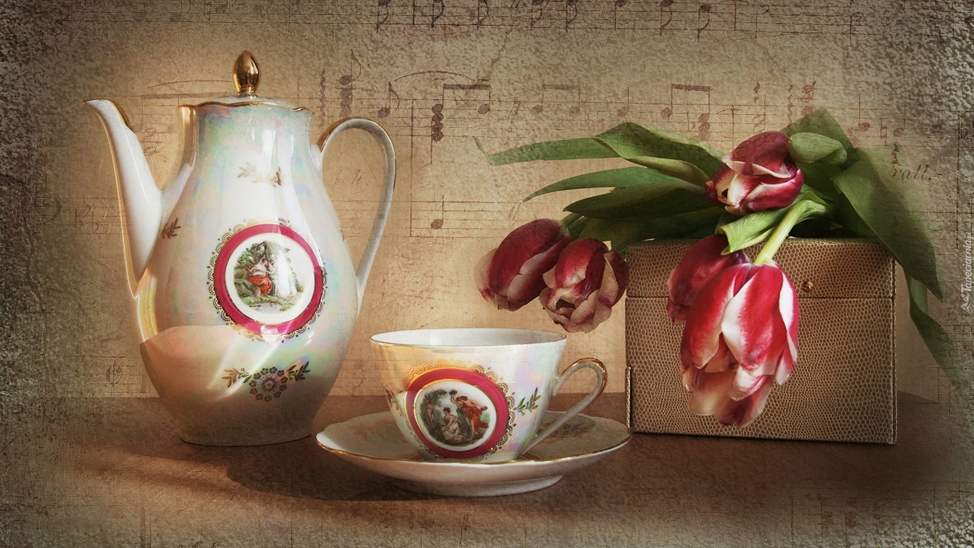 Edytor tapety: Porcelana, Tulipany, Pudełko, Nuty
