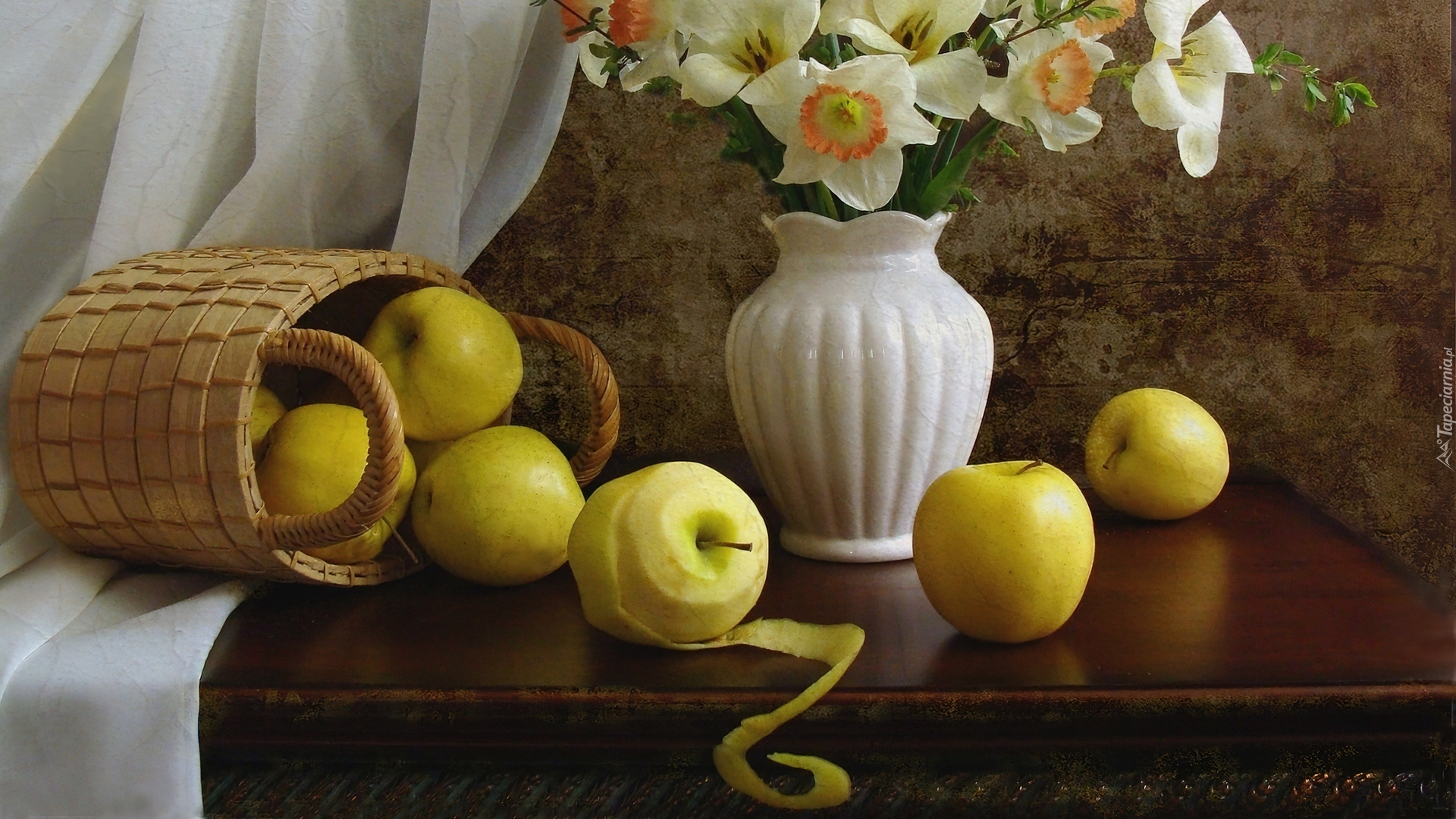 Edytor tapety: Narcyzy, Kosz, Jabłka, Wazon