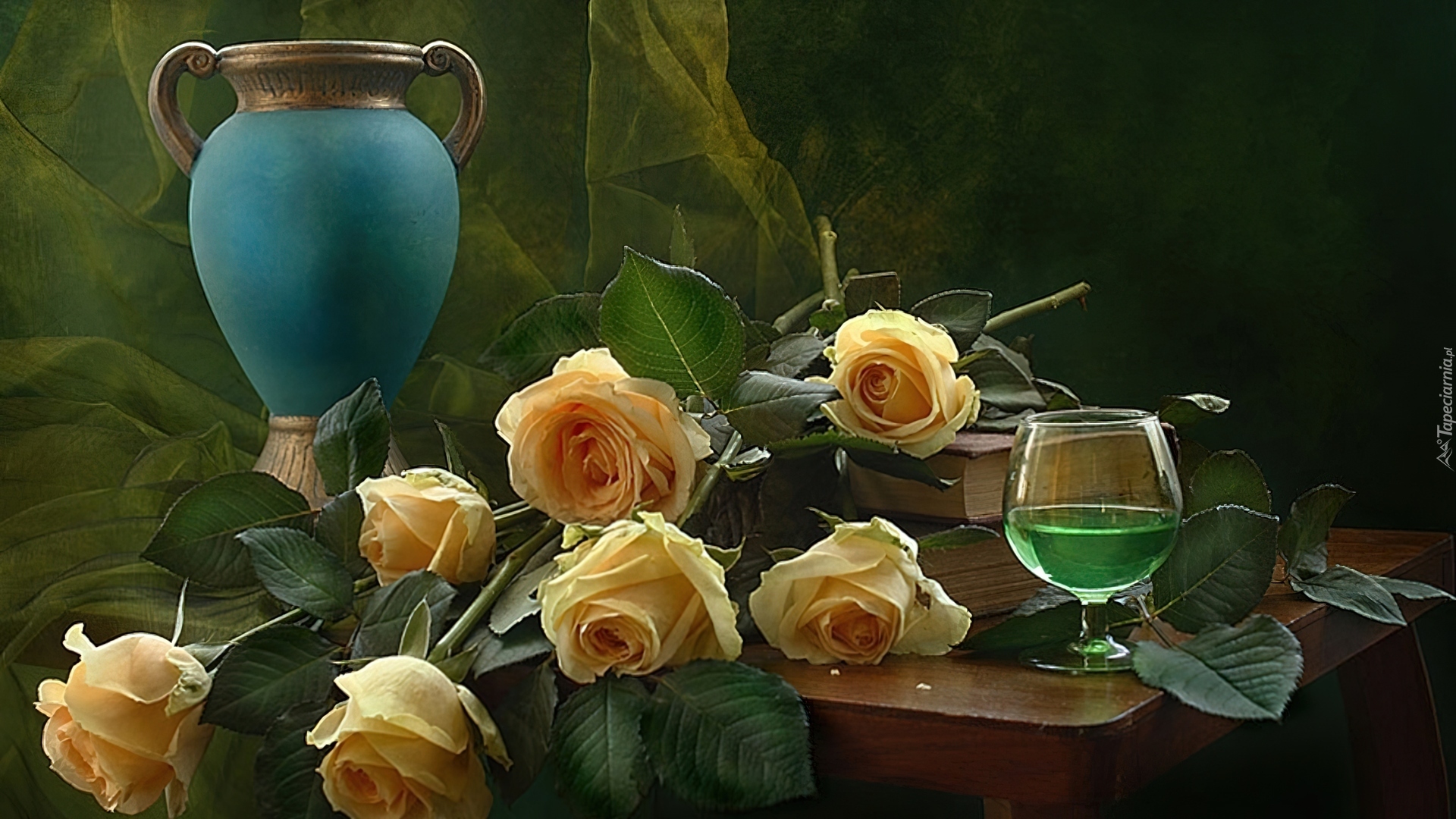 Edytor tapety: Niebieski, Dzban, Róże, Kieliszek