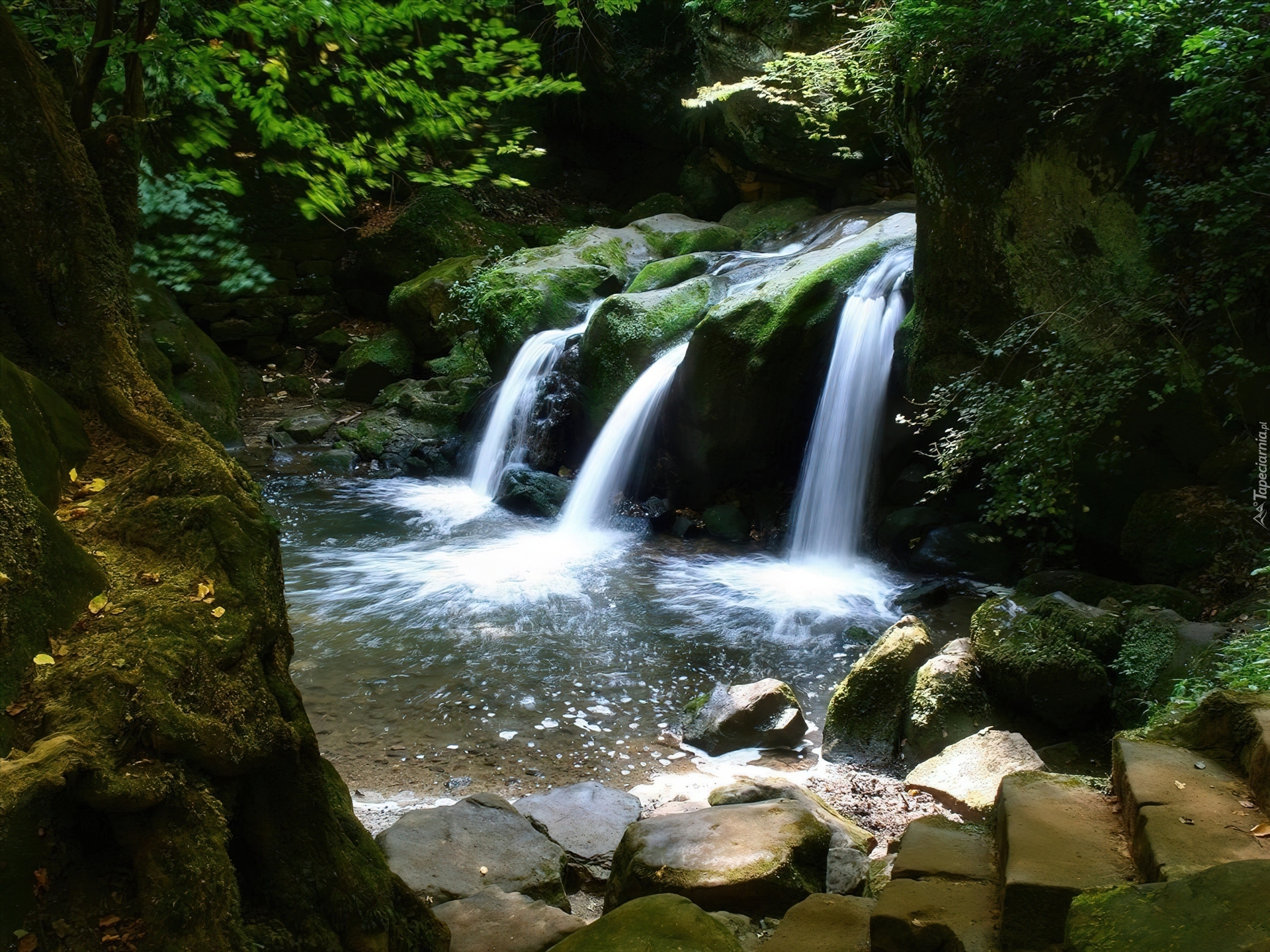 Edytor tapety: Wodospad, Skały, Schodki