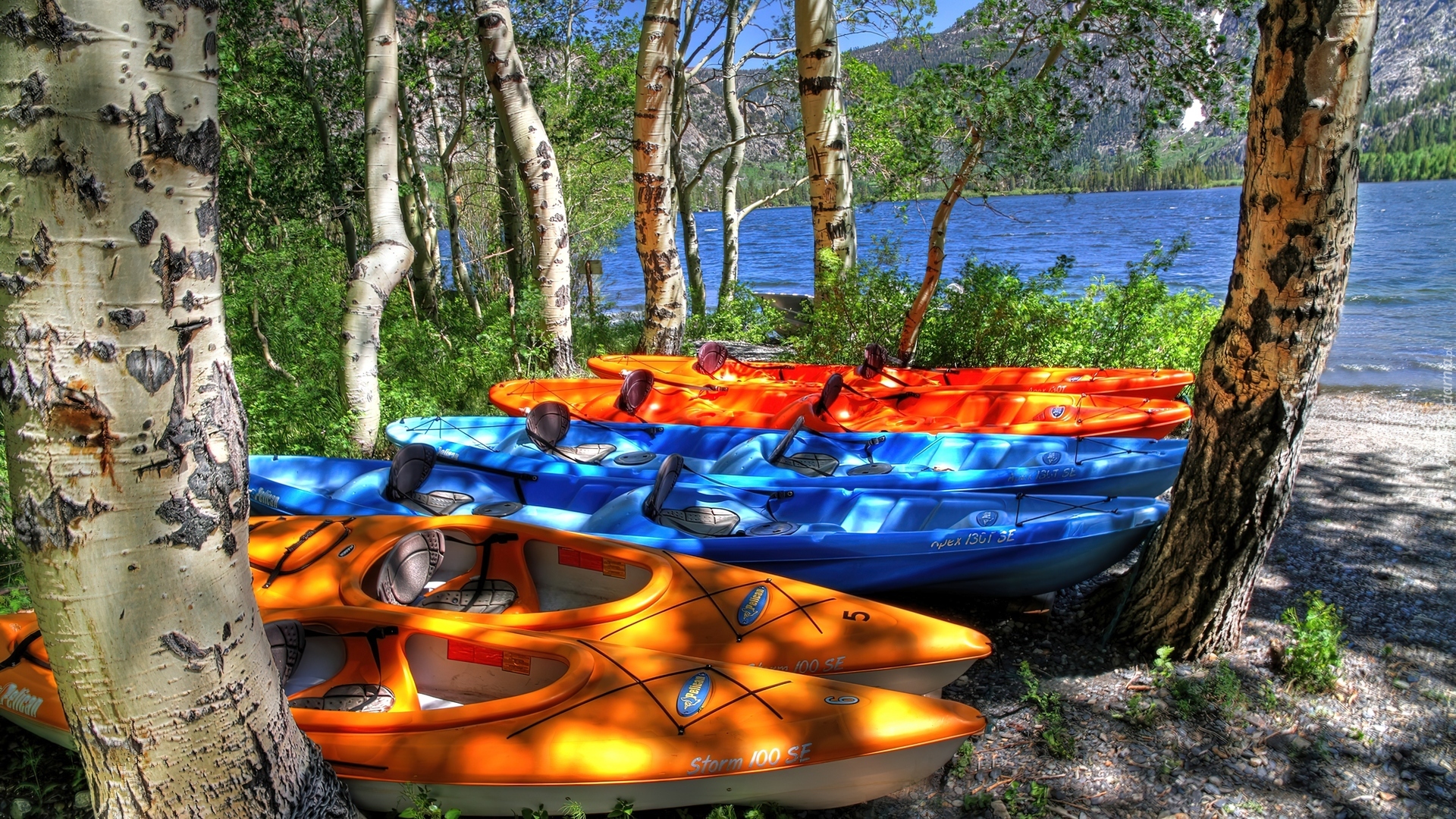 Edytor tapety: Brzozy, Rzeka, Kajaki