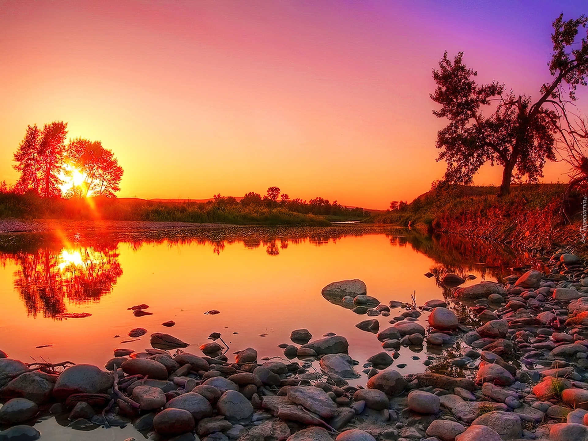 Edytor tapety: Zachód, Słońca, Jezioro, Kamienie