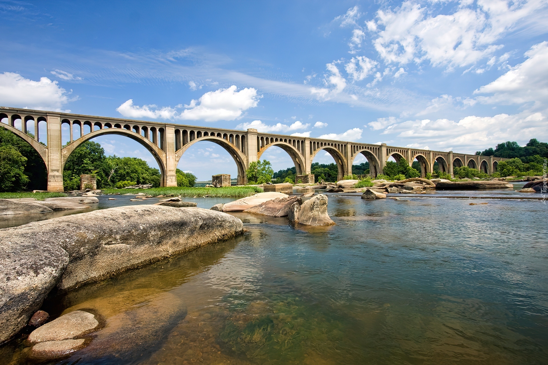 Edytor tapety: Duża, Rzeka, Most, Kamienie, Niebo, Chmury