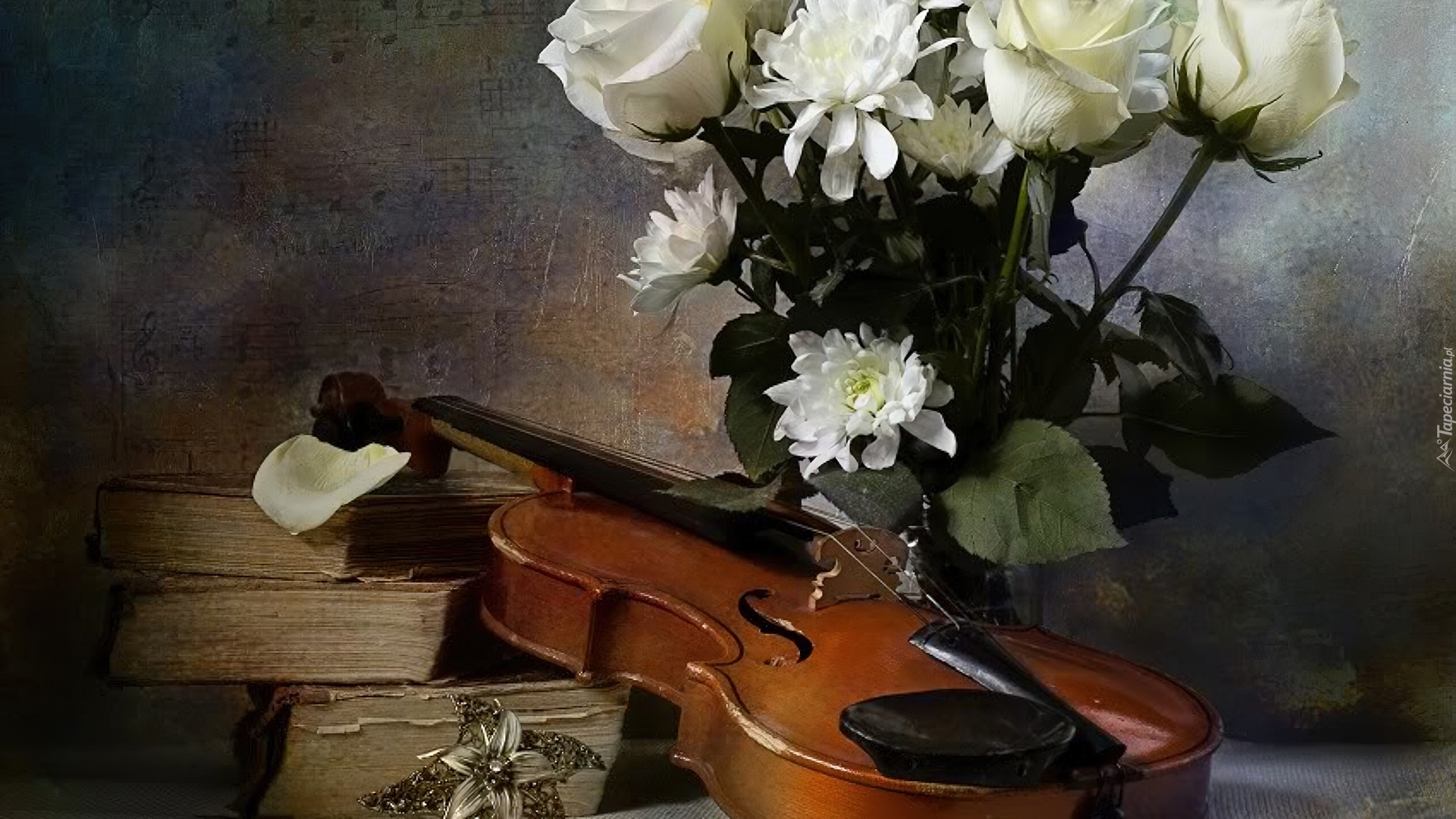 Edytor tapety: Bukiet, Kwiatów, Skrzypce, Stare, Książki