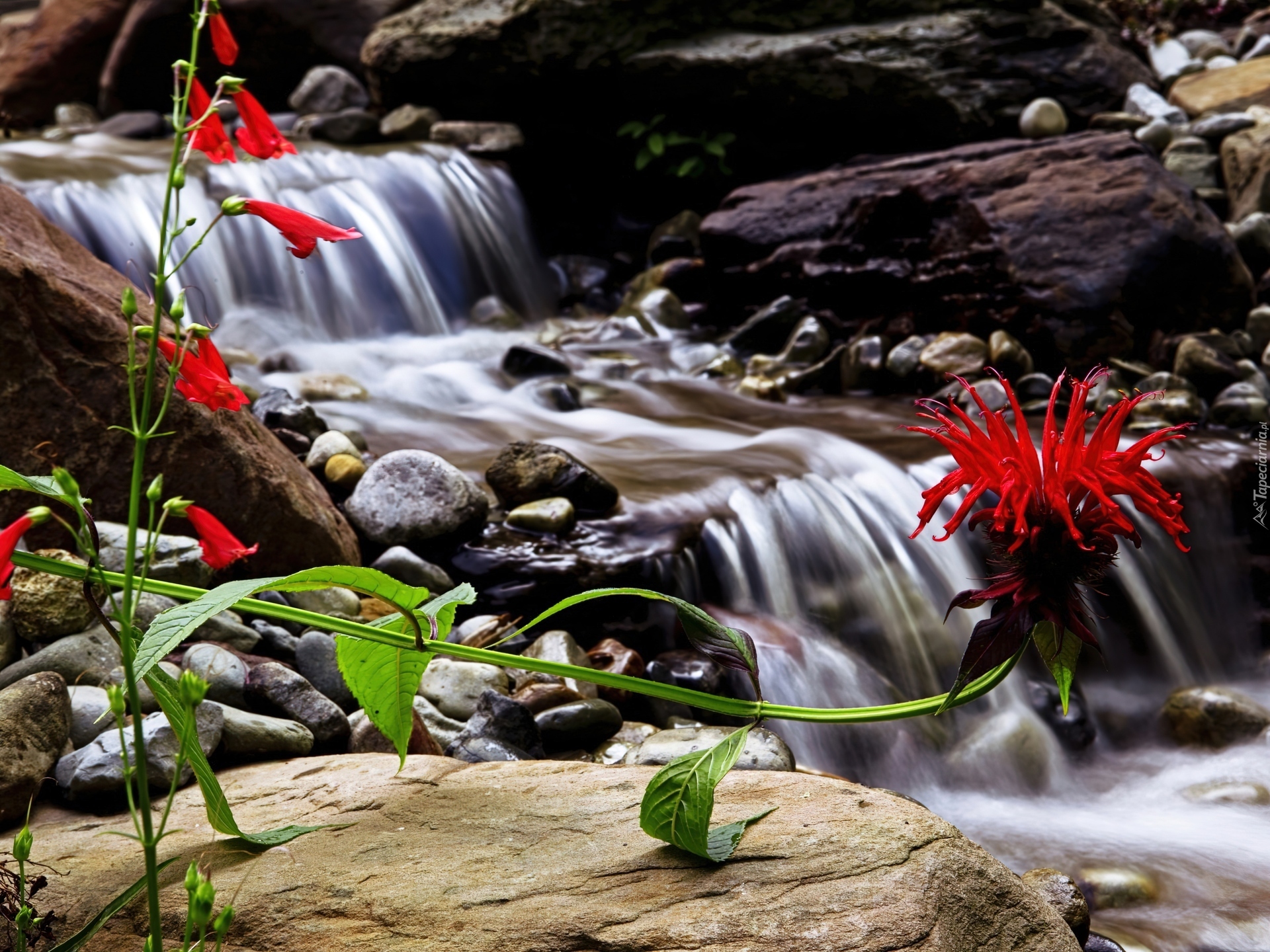 Edytor tapety: Czerwony, Kwiat, Potok, Wodospad, Kamienie