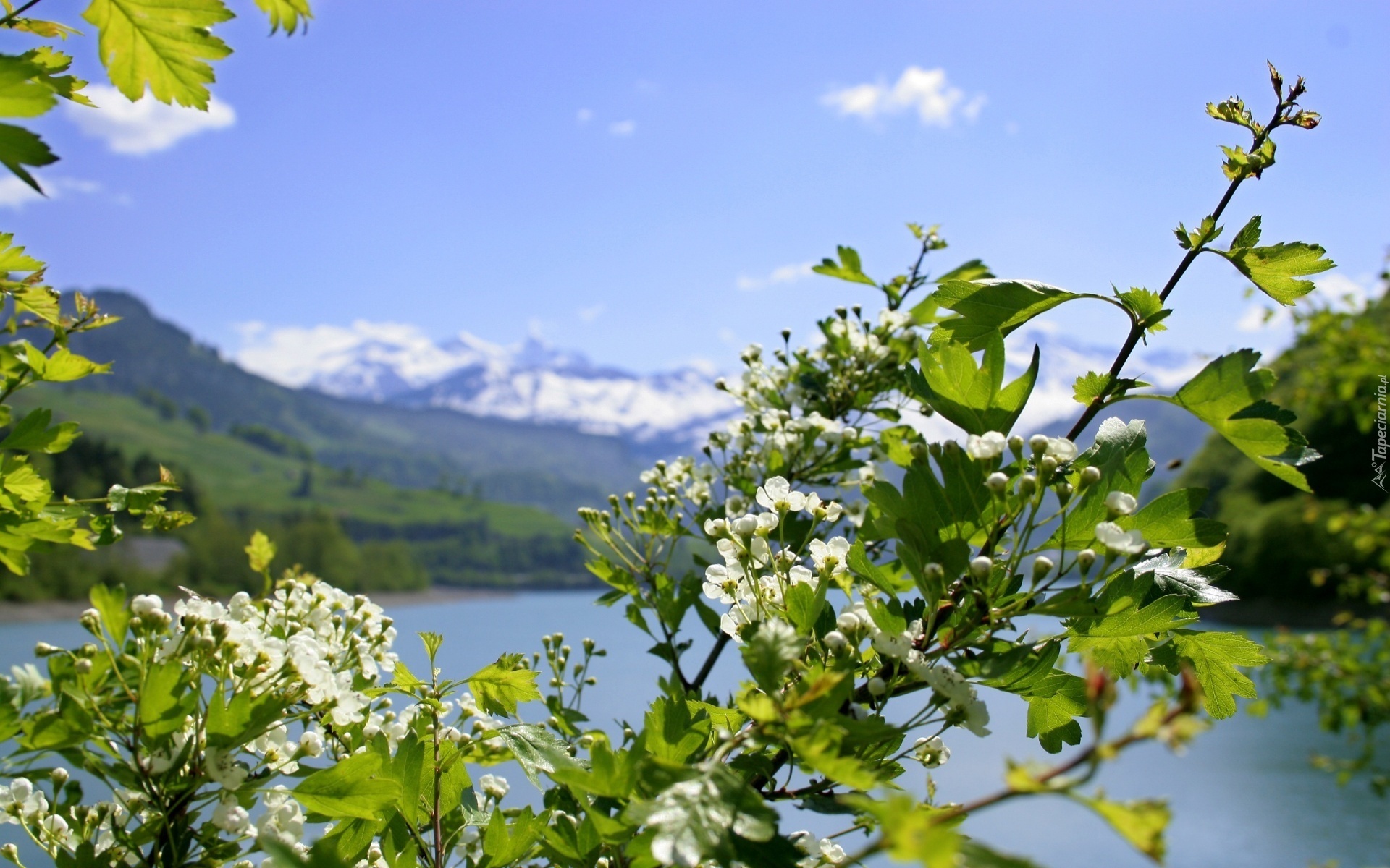 Edytor tapety: Gałązka, Kwiaty, Wiśni, Jezioro