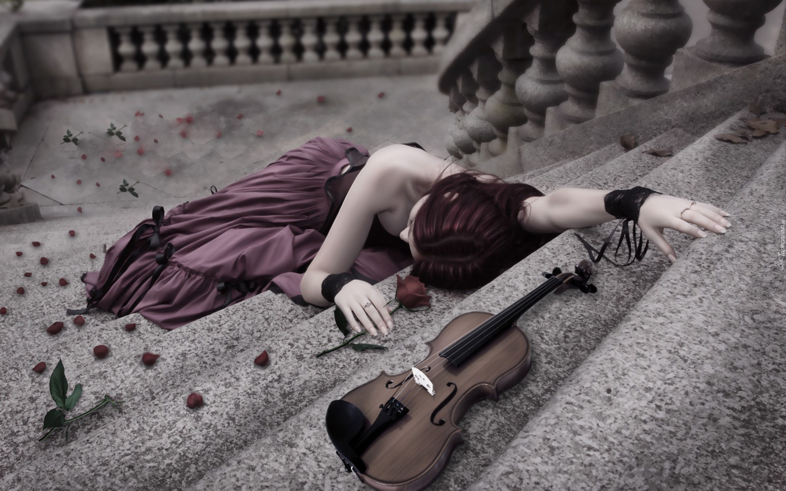 Edytor tapety: Omdlała, Skrzypaczka, Skrzypce, Schody, Róża