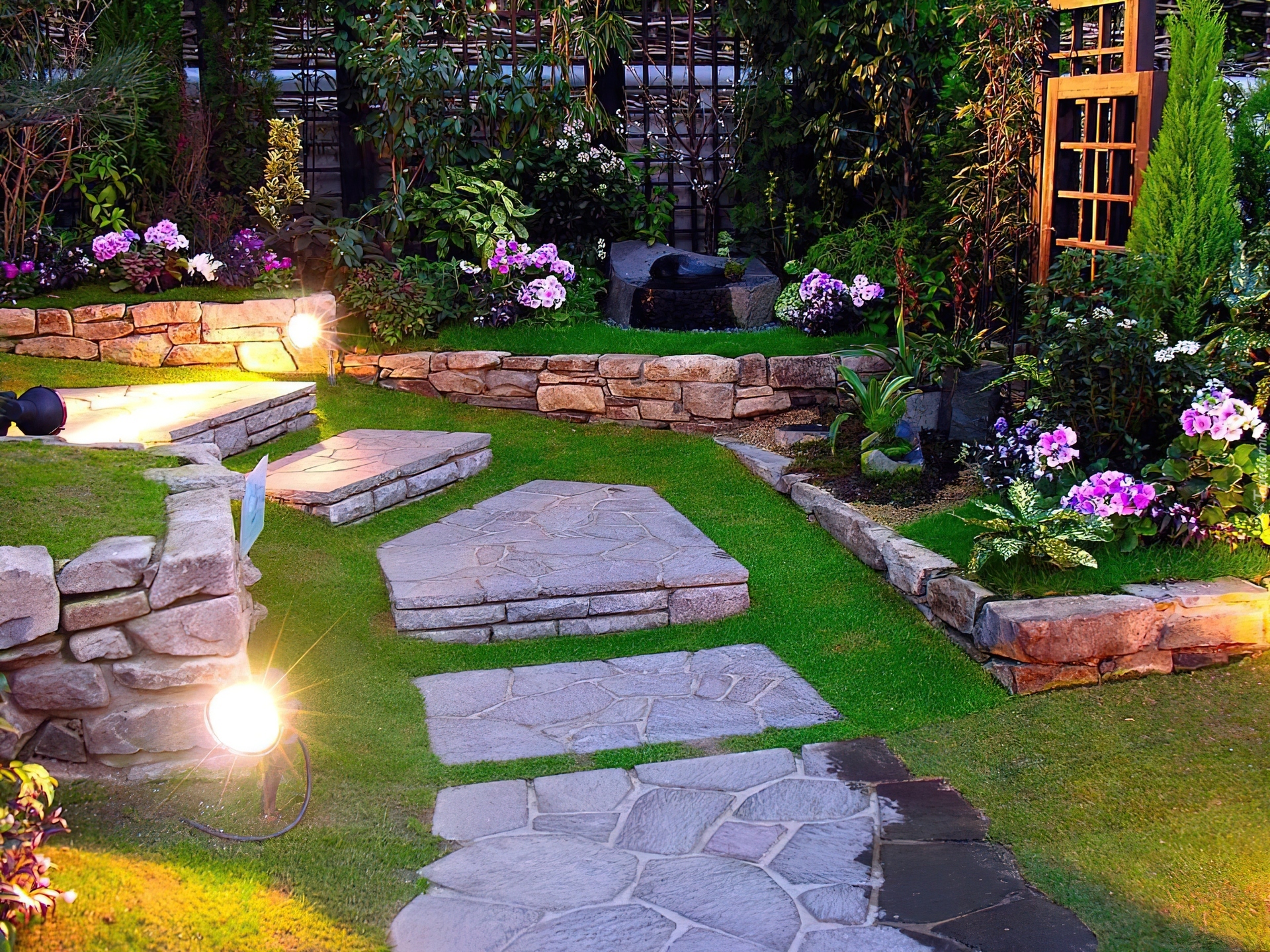 Edytor tapety: Ogród, Kwiaty, Ścieżka, Murek