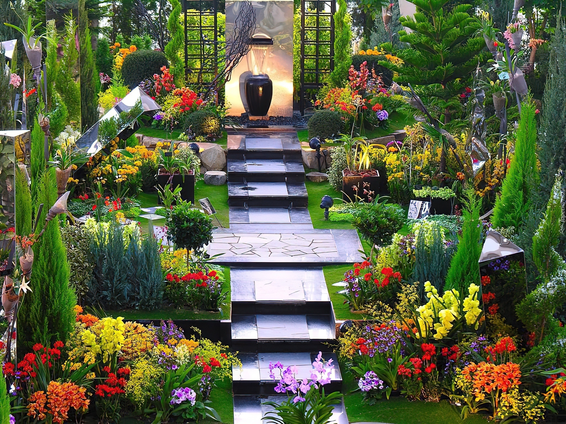 Edytor tapety: Ogród, Kwiaty, Schody, Iglaki