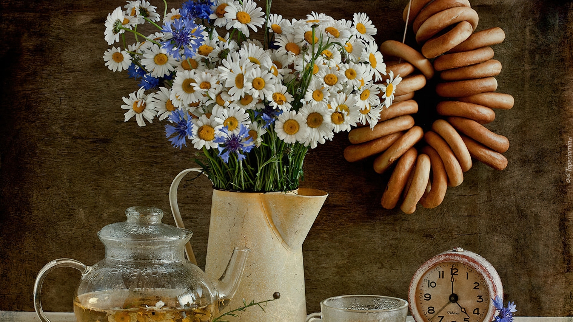 Edytor tapety: Dzbanek, Rumianek, Budzik, Obwarzanki