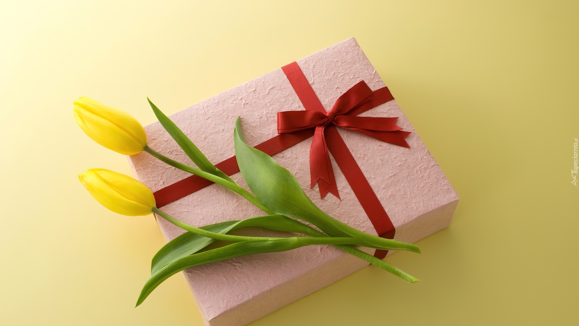 Edytor tapety: Żółte, Tulipany, Prezent, Wstążka