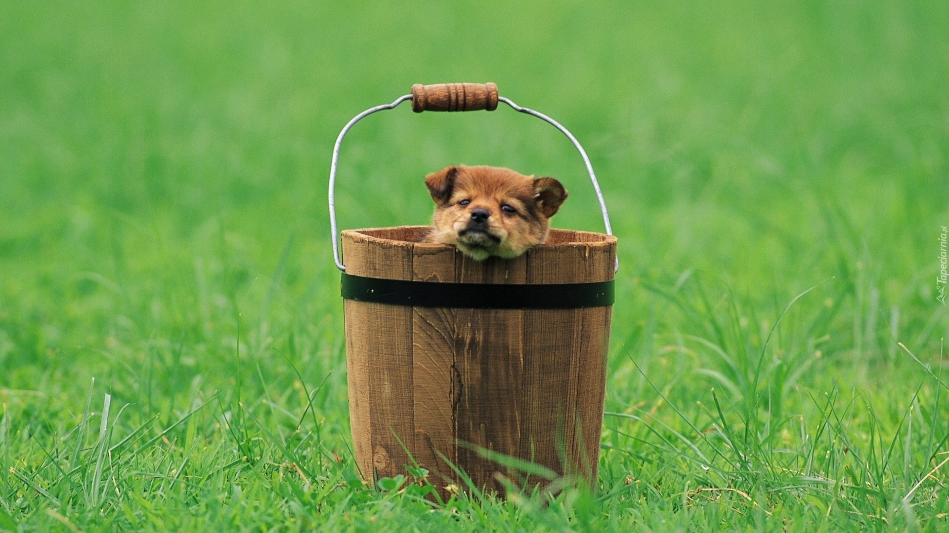 Edytor tapety: Zielona, Trawa, Wiaderko, Szczeniaczek