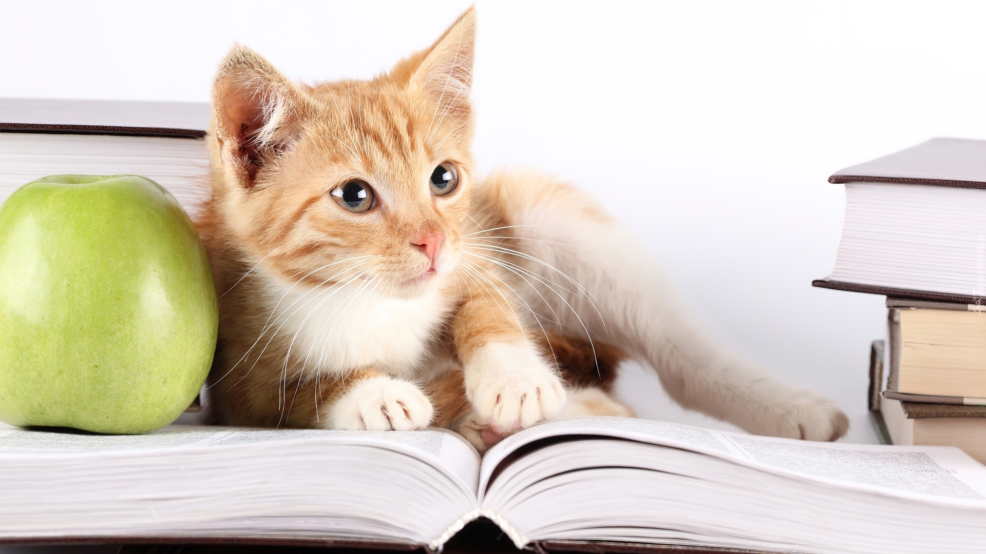 Edytor tapety: Książki, Kot, Zielone, Jabłko