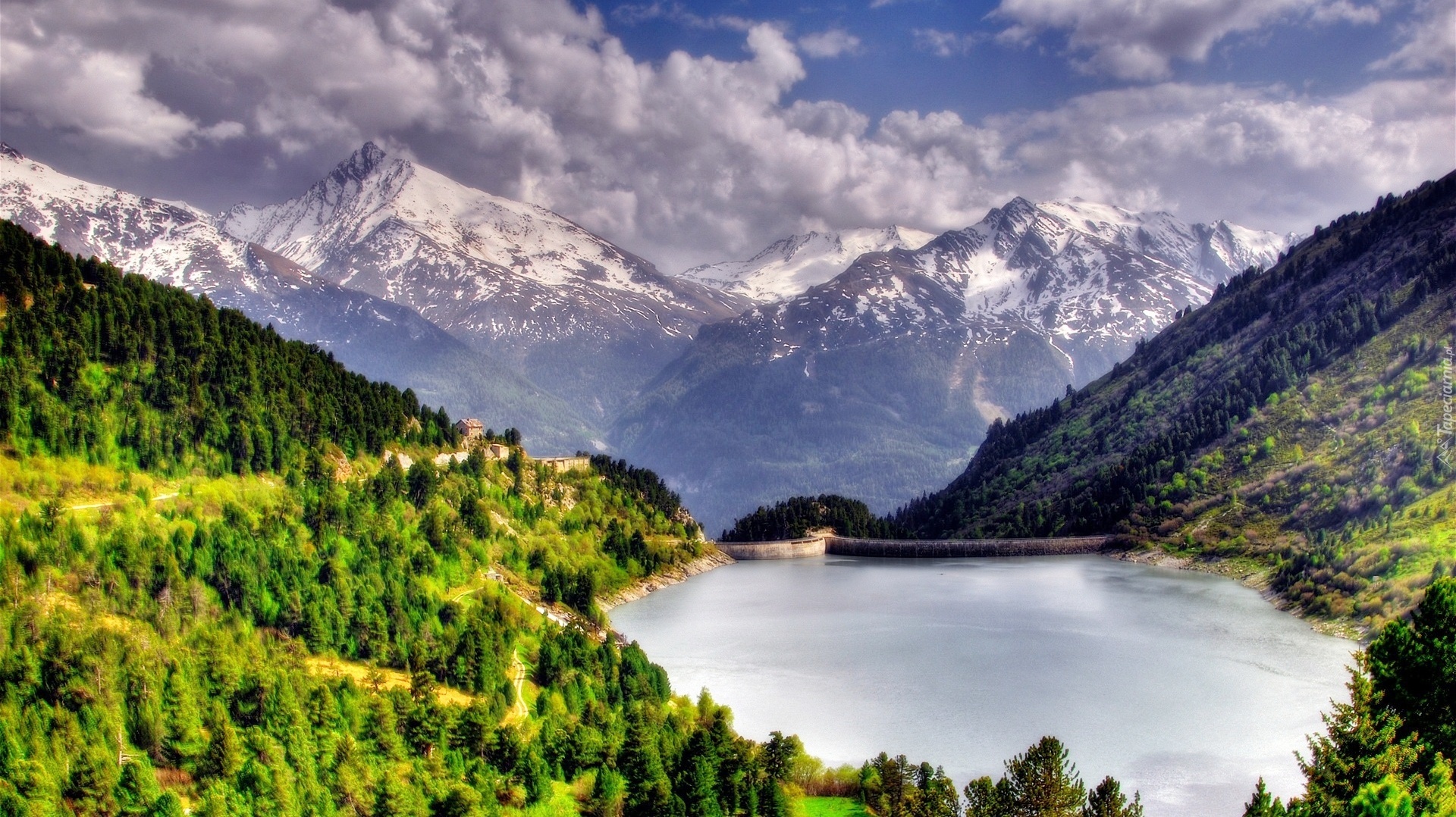 Edytor tapety: Góry, Jezioro, Drzewa, Zapora