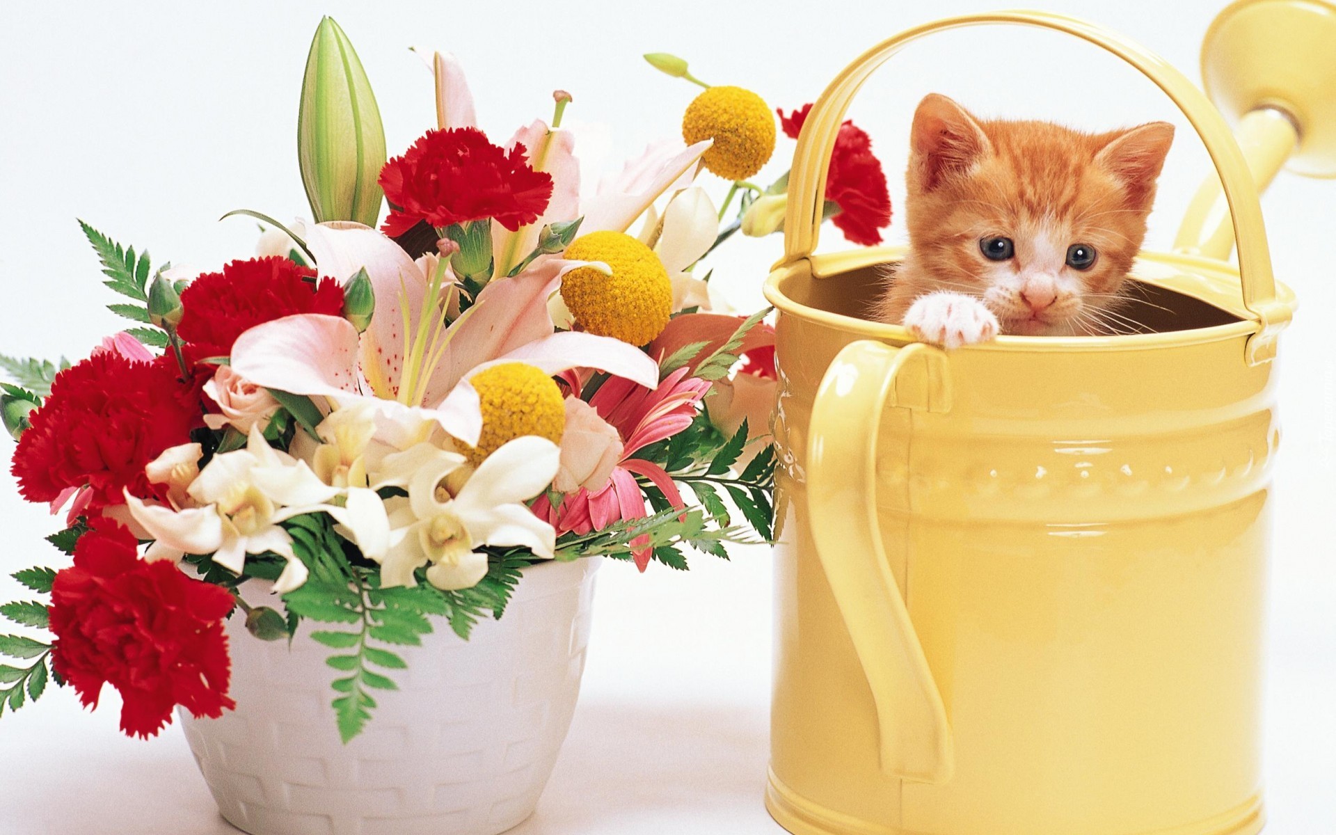 Edytor tapety: Mały, Kociak, Konewka, Bukiet, Kwiatów