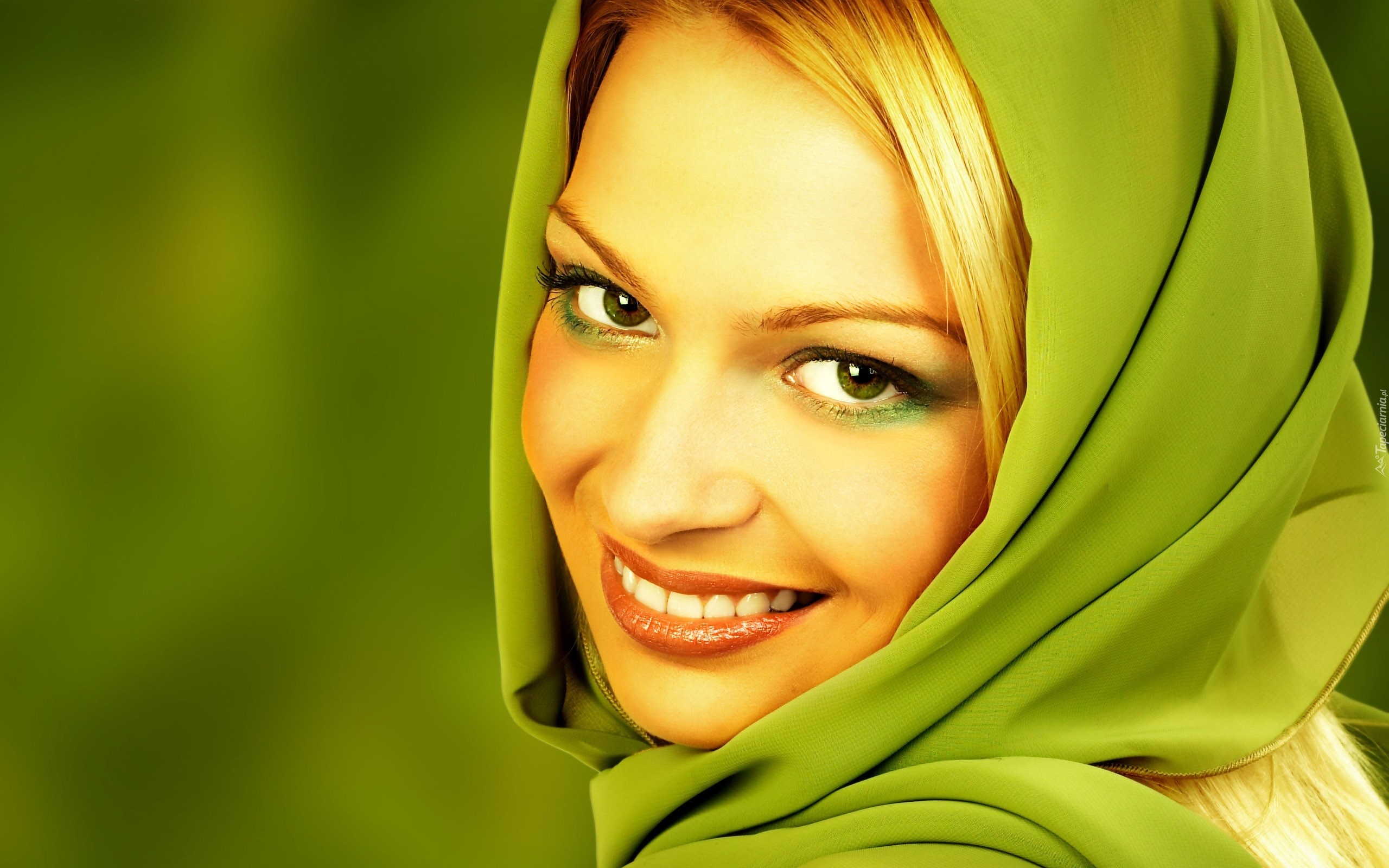 Edytor tapety: Uśmiechnięta, Kobieta, Zielona, Chustka