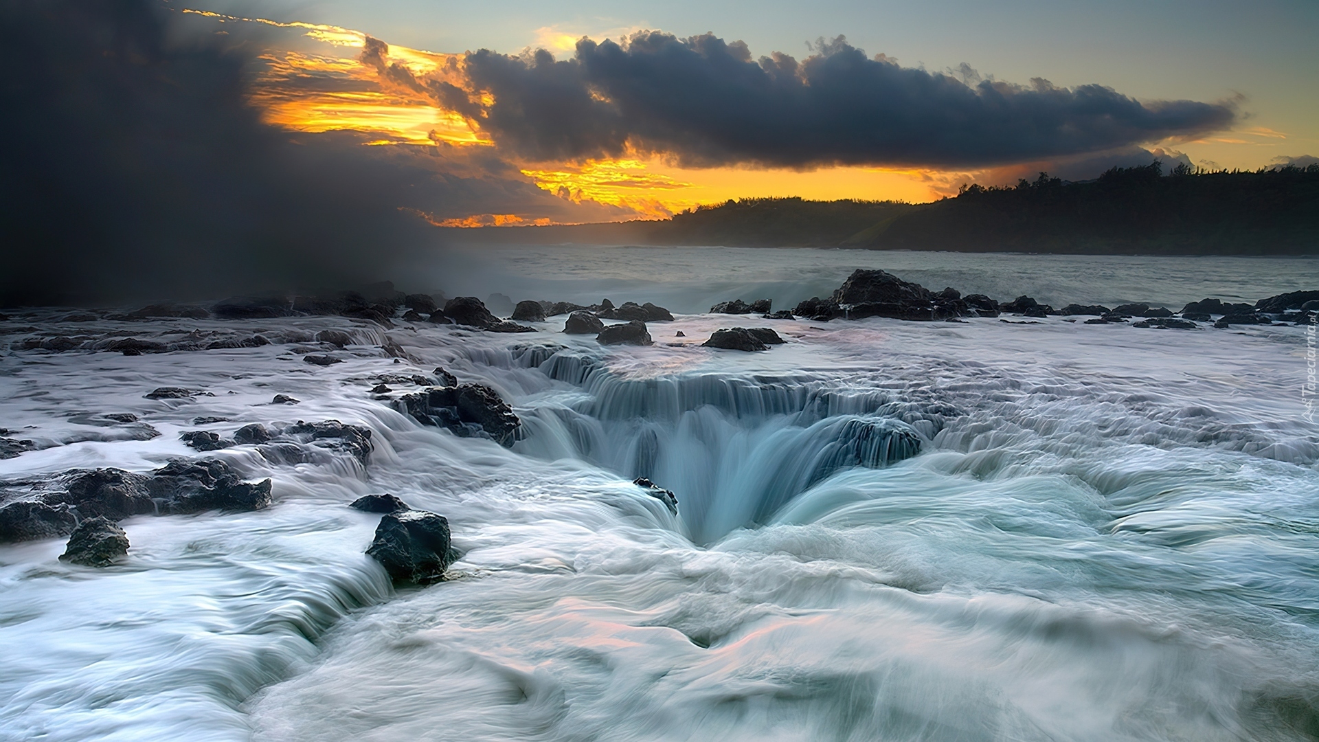Edytor tapety: Skały, Zachód, Słońca, Wodospady, Woda