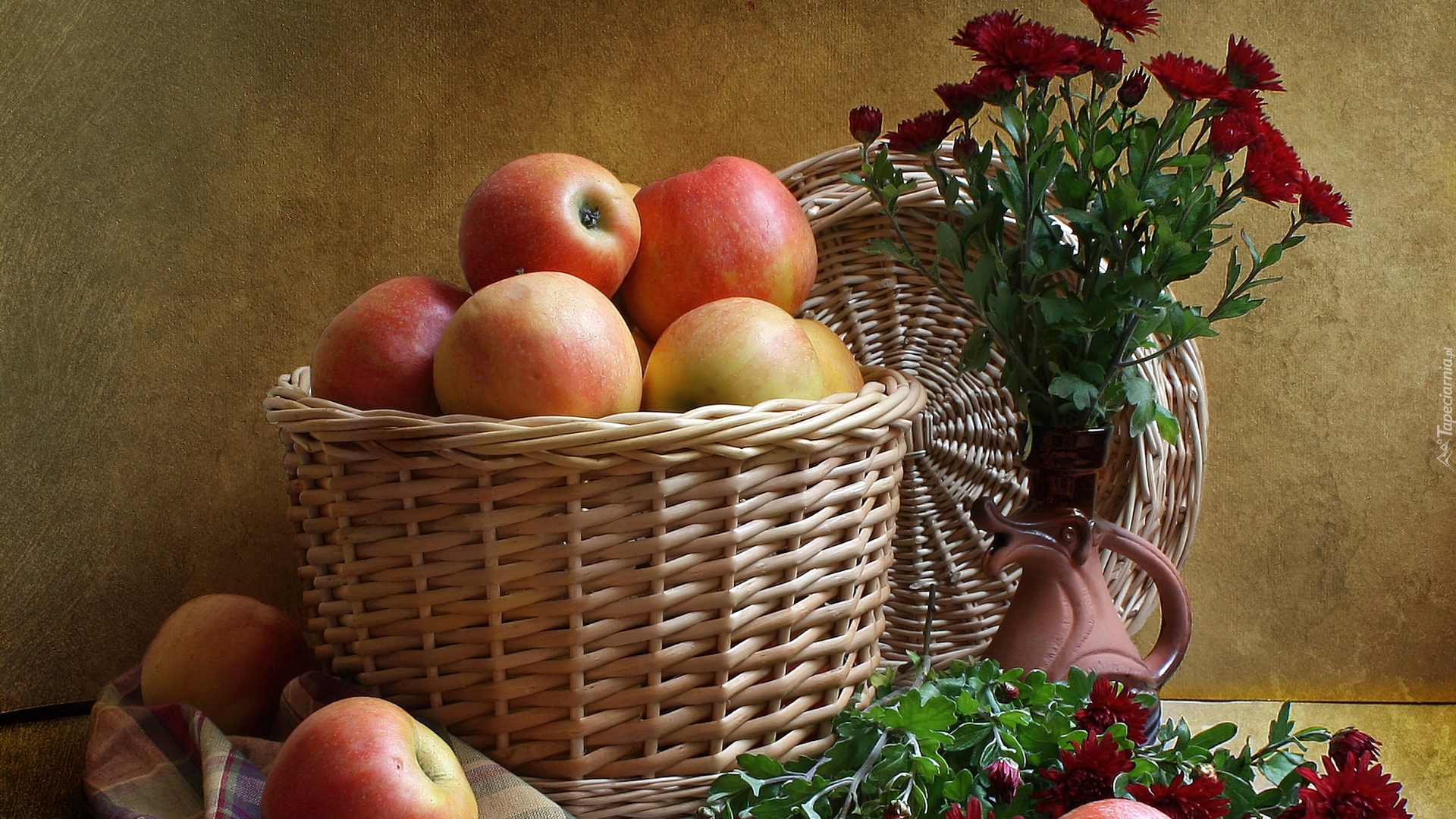 Edytor tapety: Kosz, Wiklinowy, Jabłka, Kwiaty