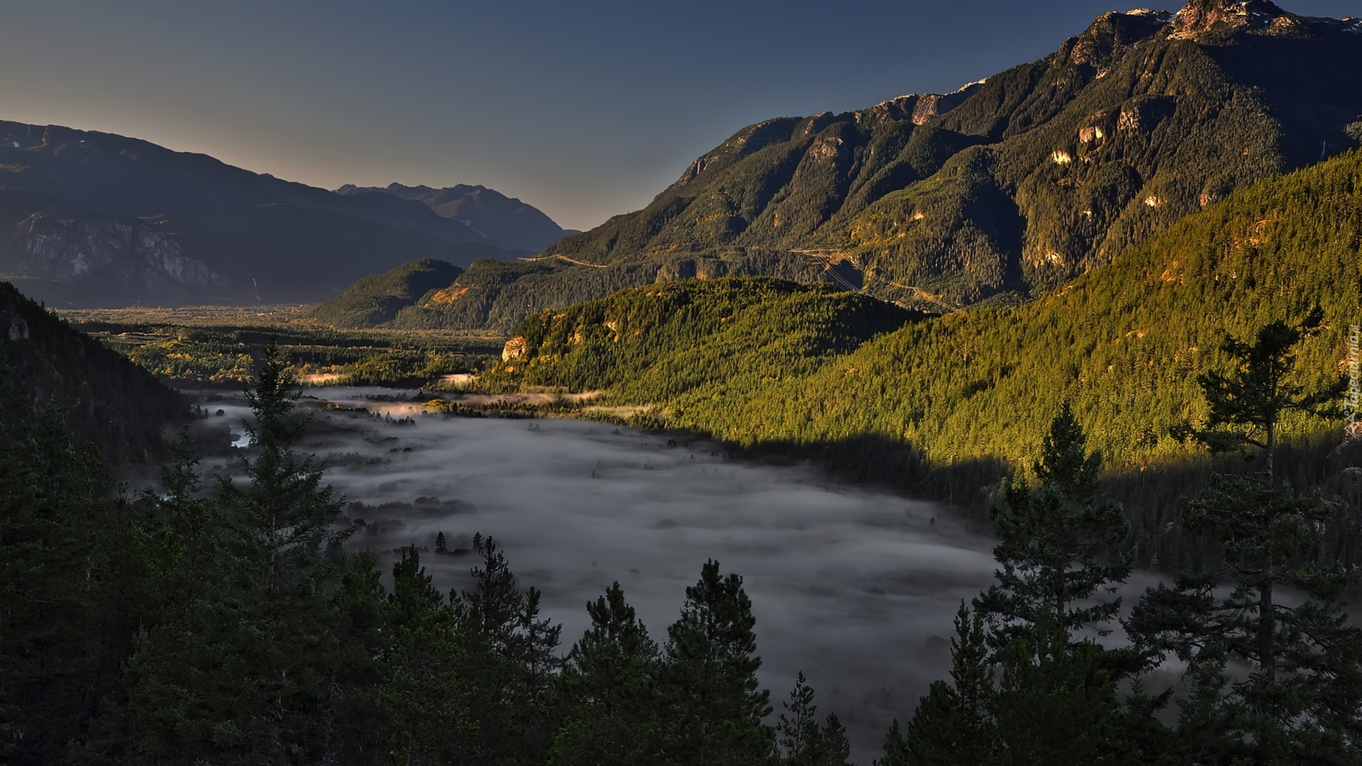 Edytor tapety: Dolina, Góry, Drzewa, Skały, Rzeka