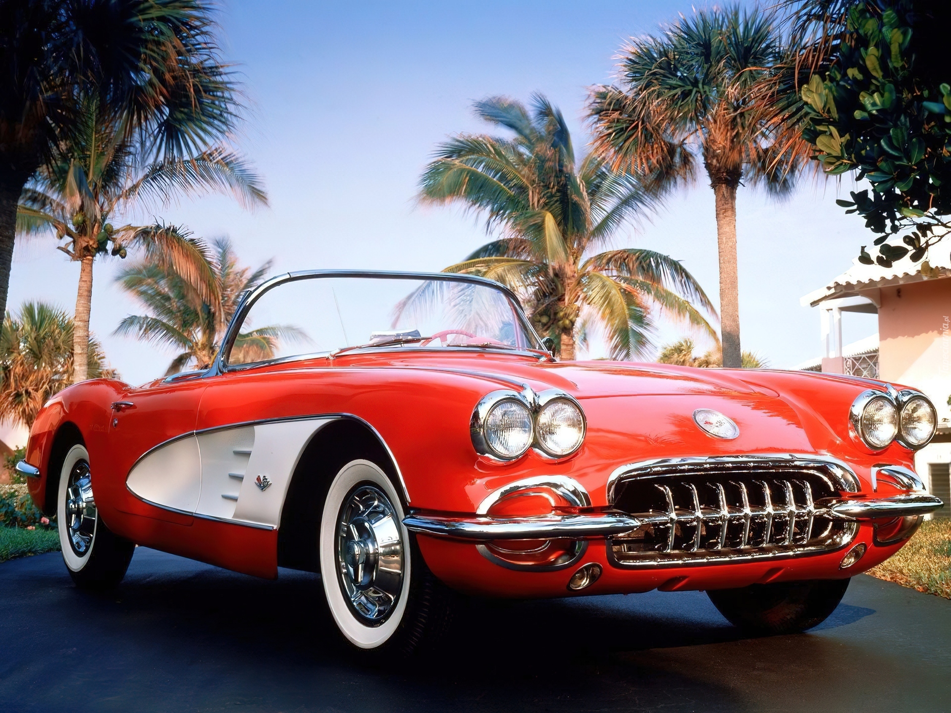 Edytor tapety: Chevrolet Corvette C1, Czerwony, Chrom, Palmy