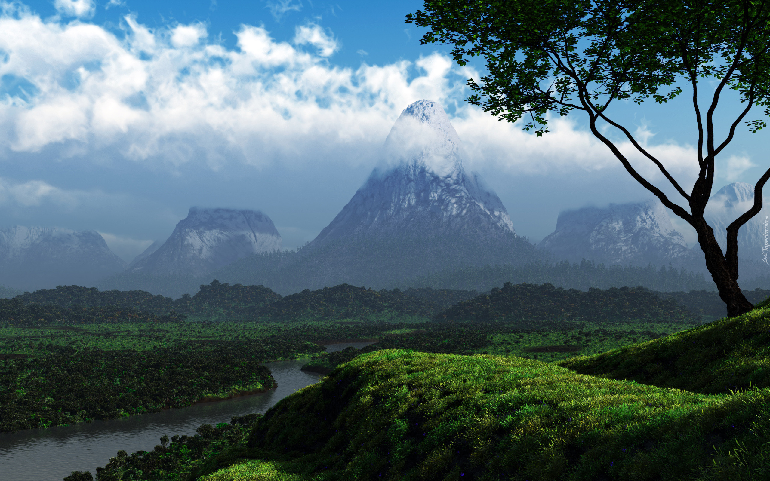 Edytor tapety: Rzeka, Góry, Drzewa, Chmury