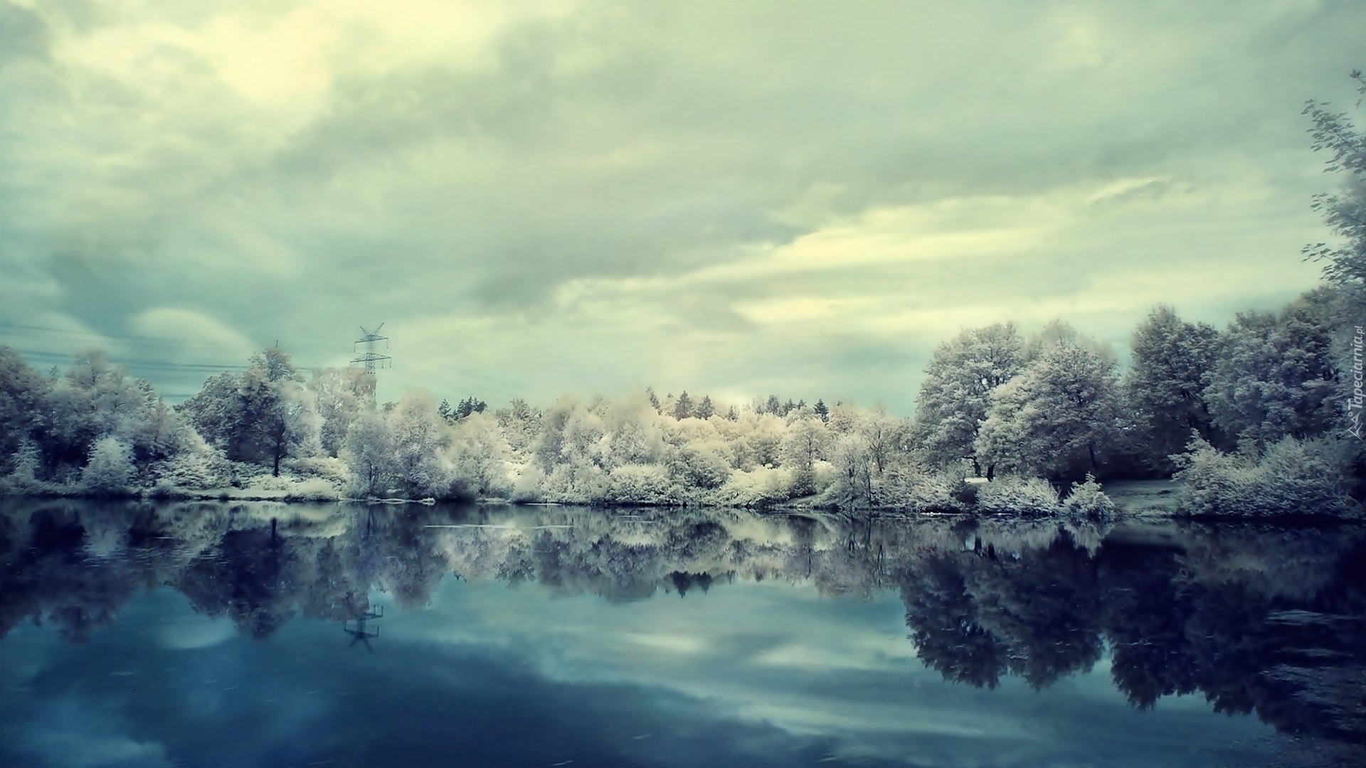 Edytor tapety: Ośnieżone, Drzewa, Chmury, Jezioro, Zima