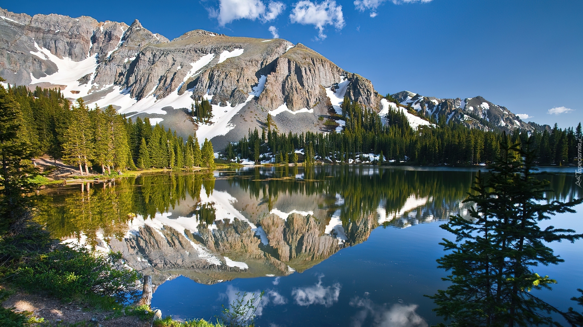 Edytor tapety: Jezioro, Góry, Śnieg, Świerki