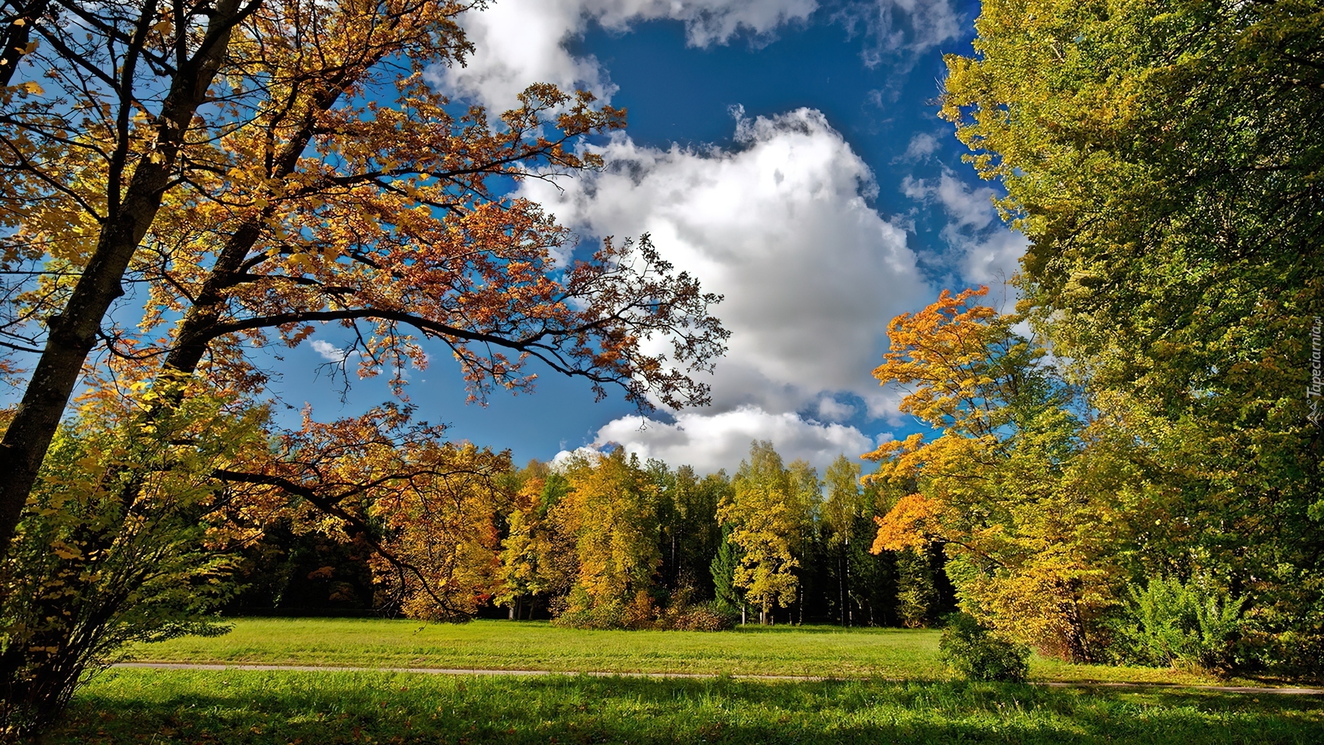 Edytor tapety: Złota, Jesień, Las, Białe, Obłoki