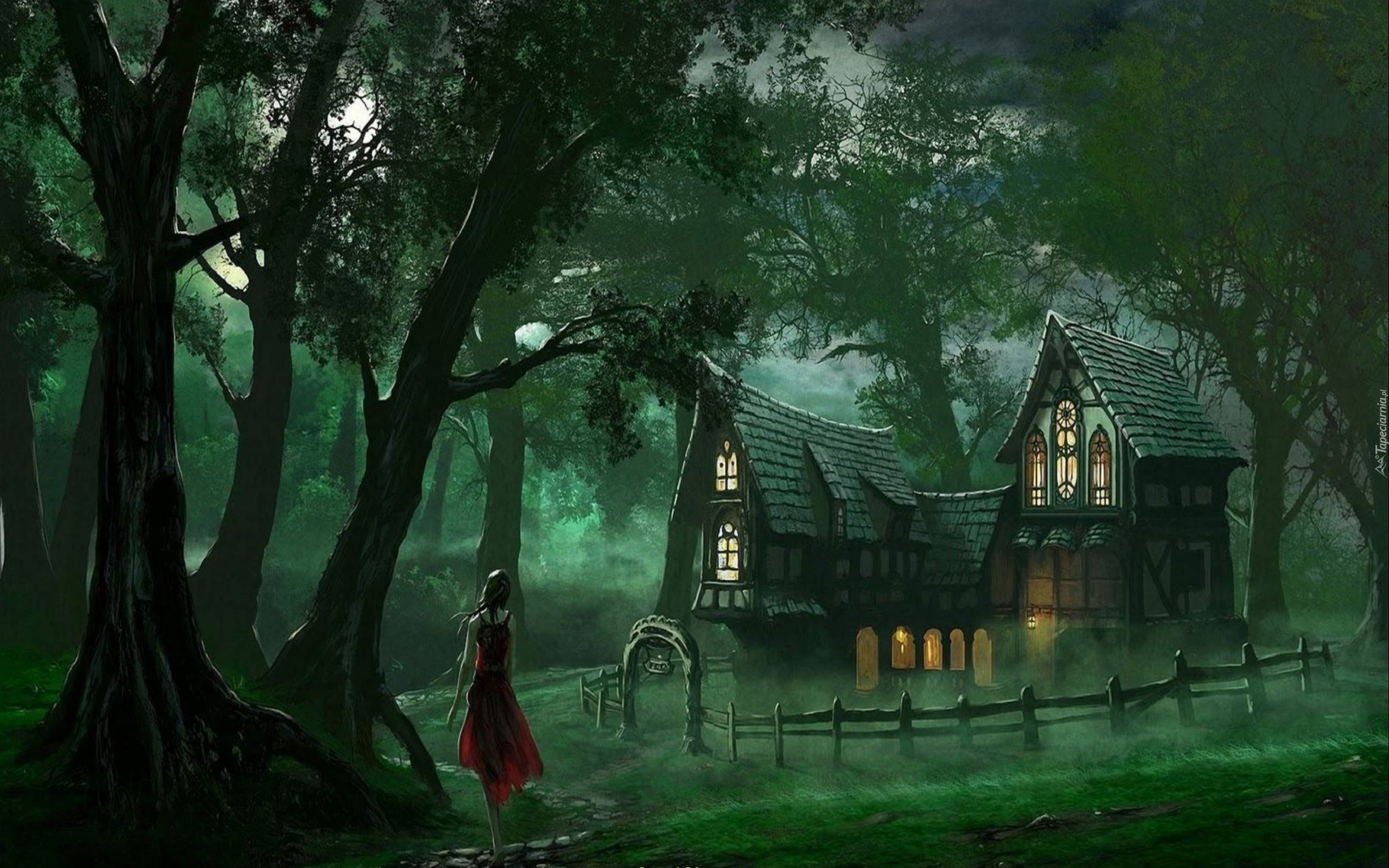 Edytor tapety: Domek, Drzewa, Dziewczyna, Płot, Noc
