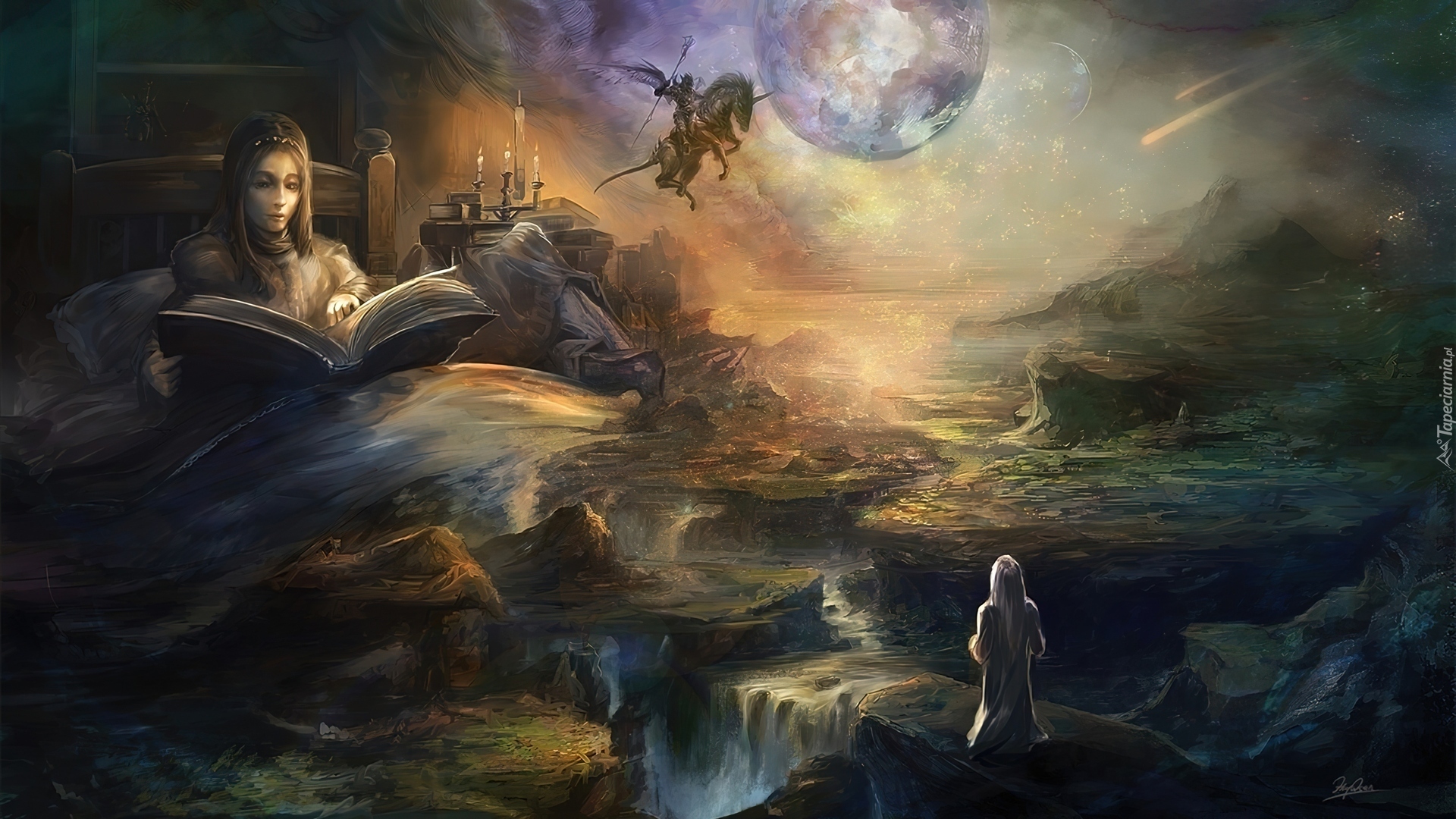 Edytor tapety: Łóżko, Dziewczyna, Książka, Ksieżyc, Jednorożec