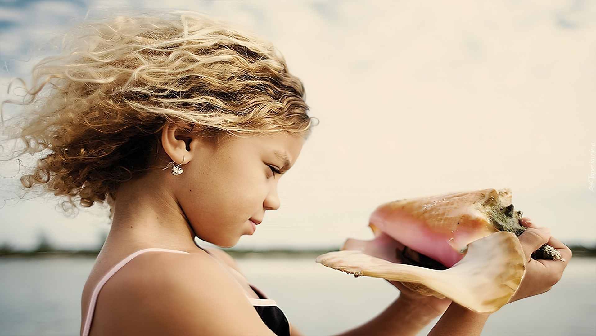 Edytor tapety: Dziewczynka, Muszla, Dłonie, Rozwiane Włosy