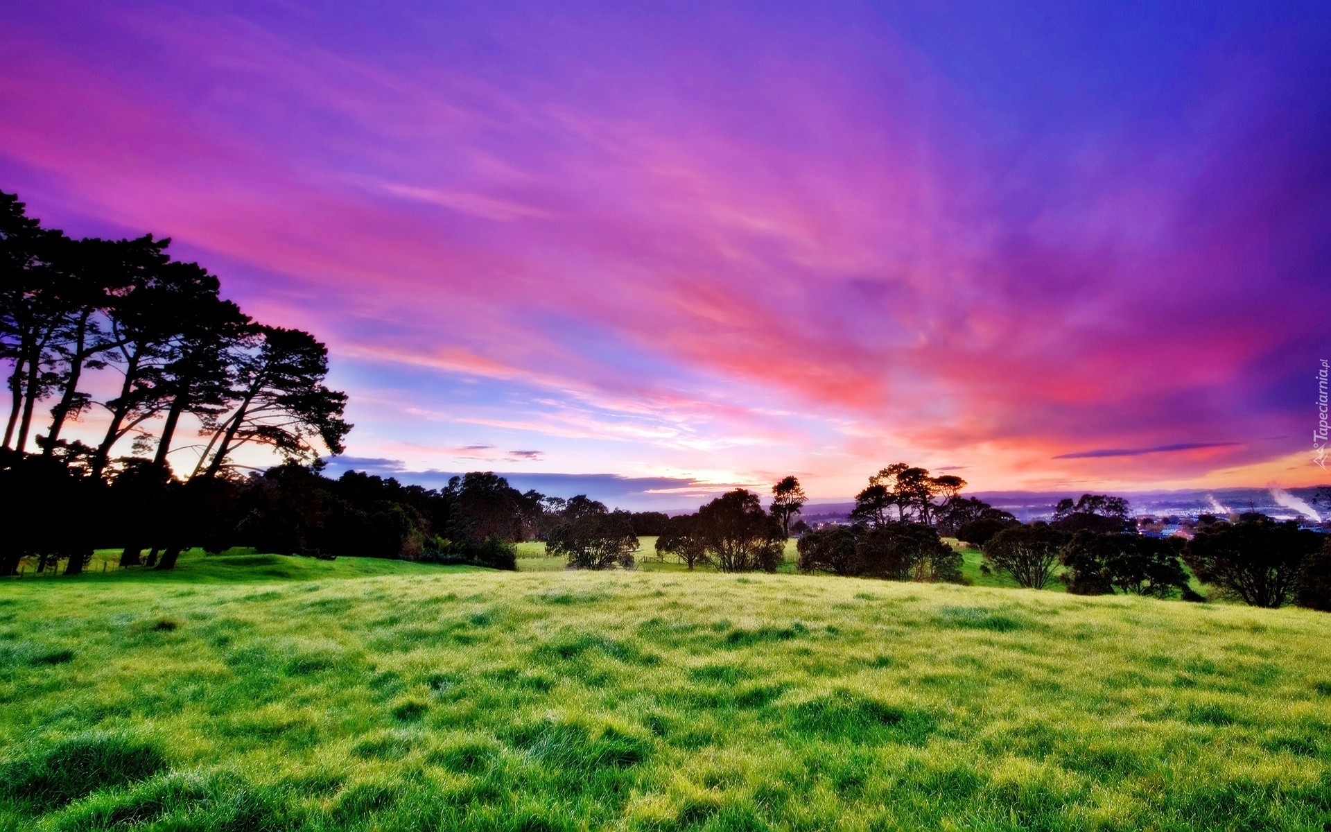 Edytor tapety: Zachód, Słońca, Drzewa, Łąka