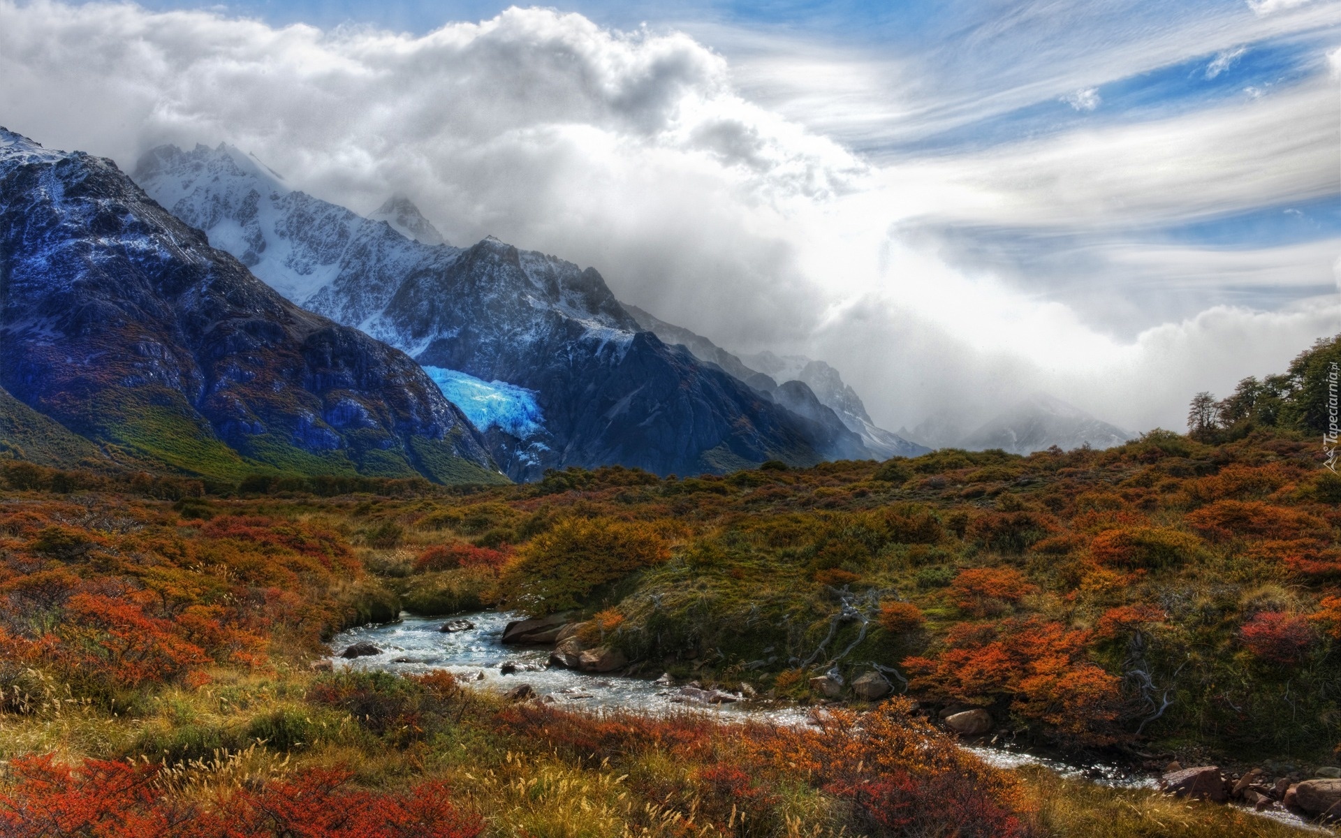 Edytor tapety: Góry, Chmury, Strumyk, Krzewy, Jesień