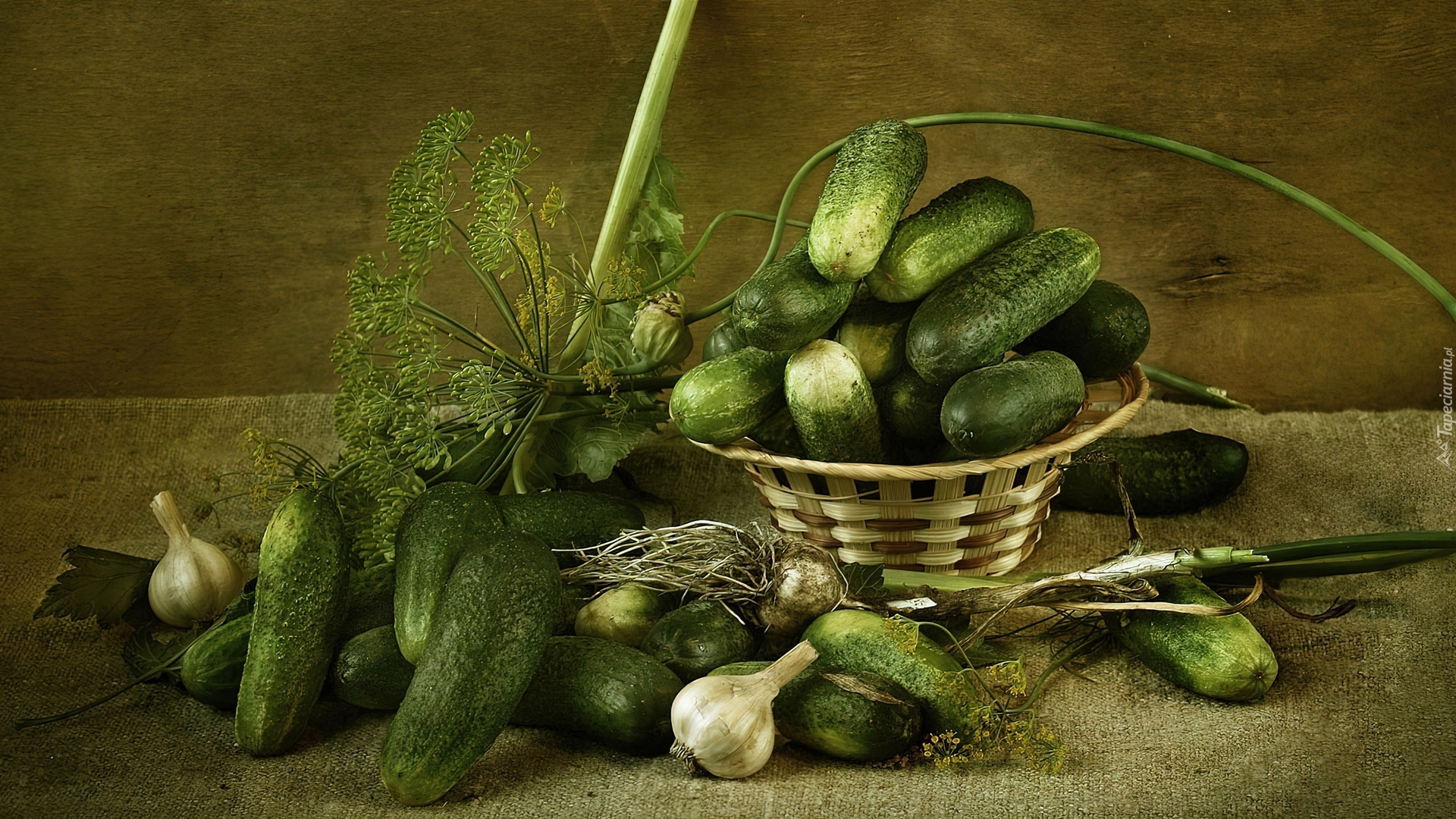 Edytor tapety: Zielone, Ogórki, Czosnek, Koperek, Koszyk