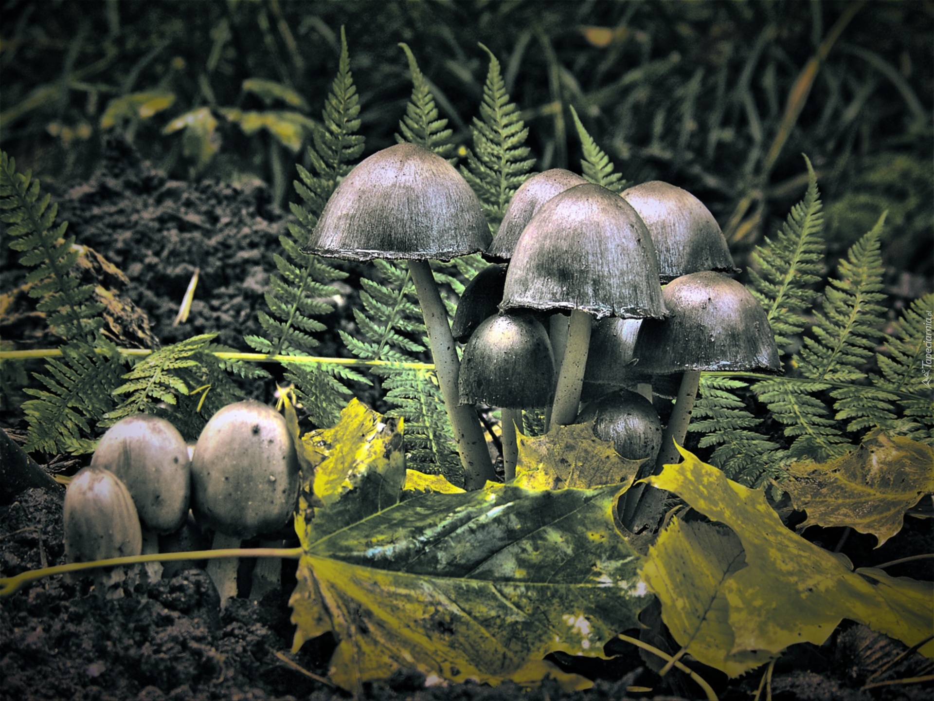 Edytor tapety: Muchomory, Paprocie, Liście