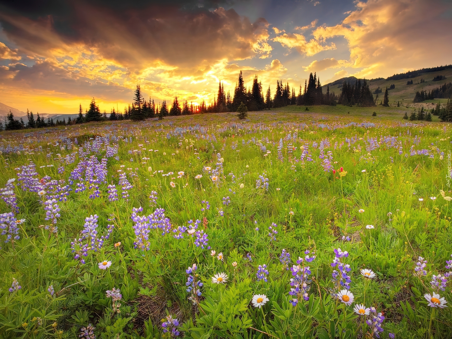 Edytor tapety: Łąka, Zachód, Słońca, Łubin