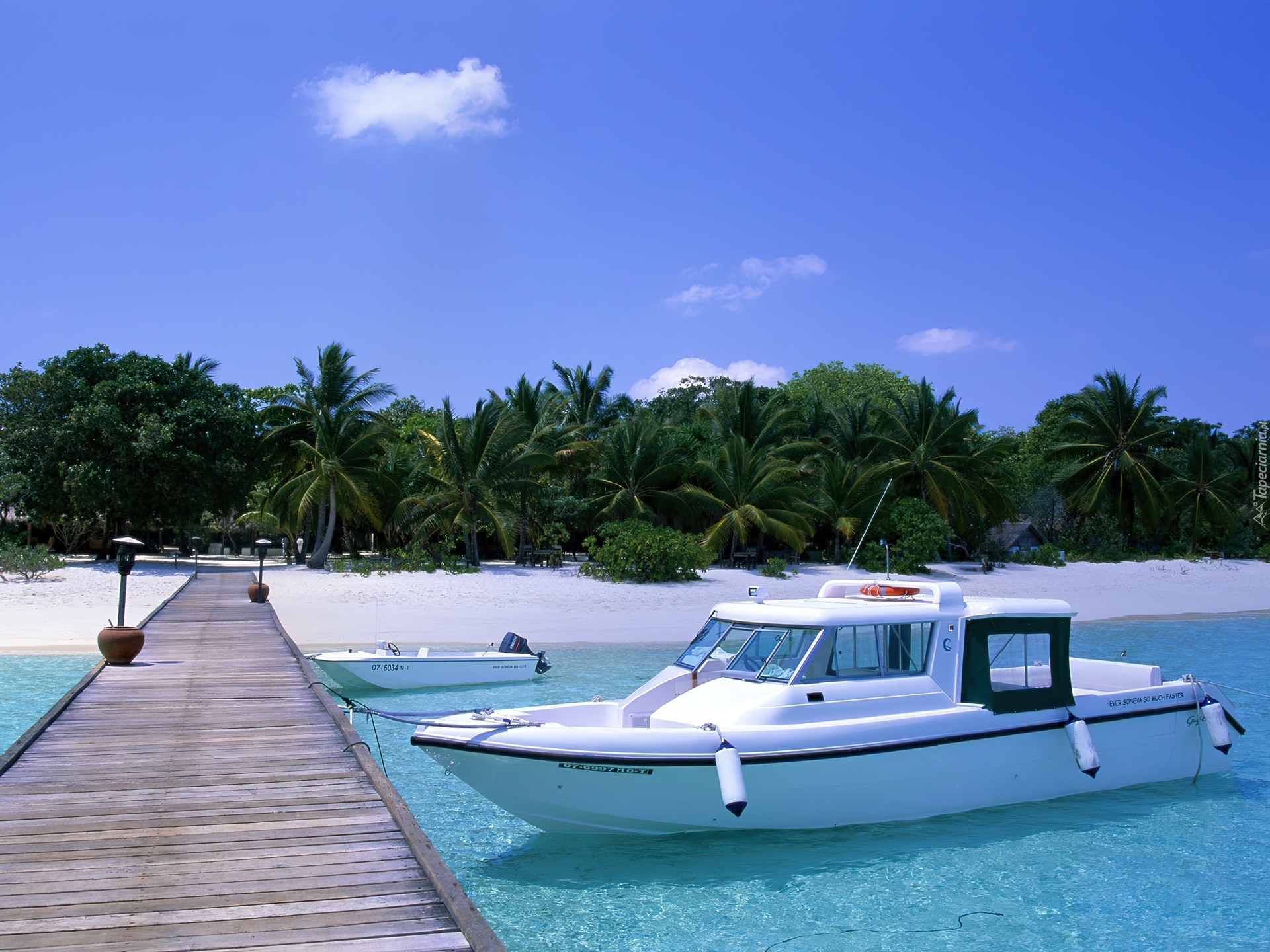 Edytor tapety: Plaża, Palmy, Pomost, Motorówka