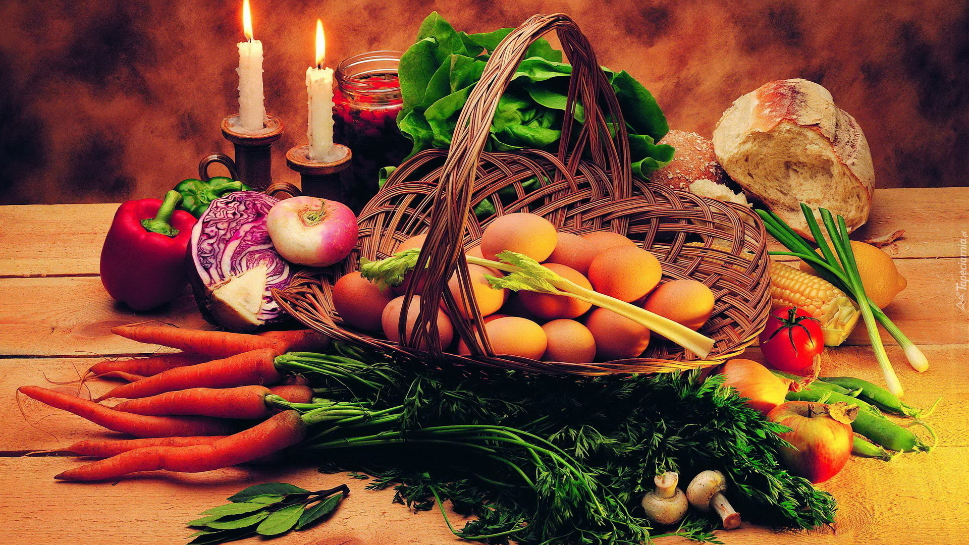 Edytor tapety: Kompozycja, Koszyk, Jajka, Świece, Sałata, Marchew, Warzywa
