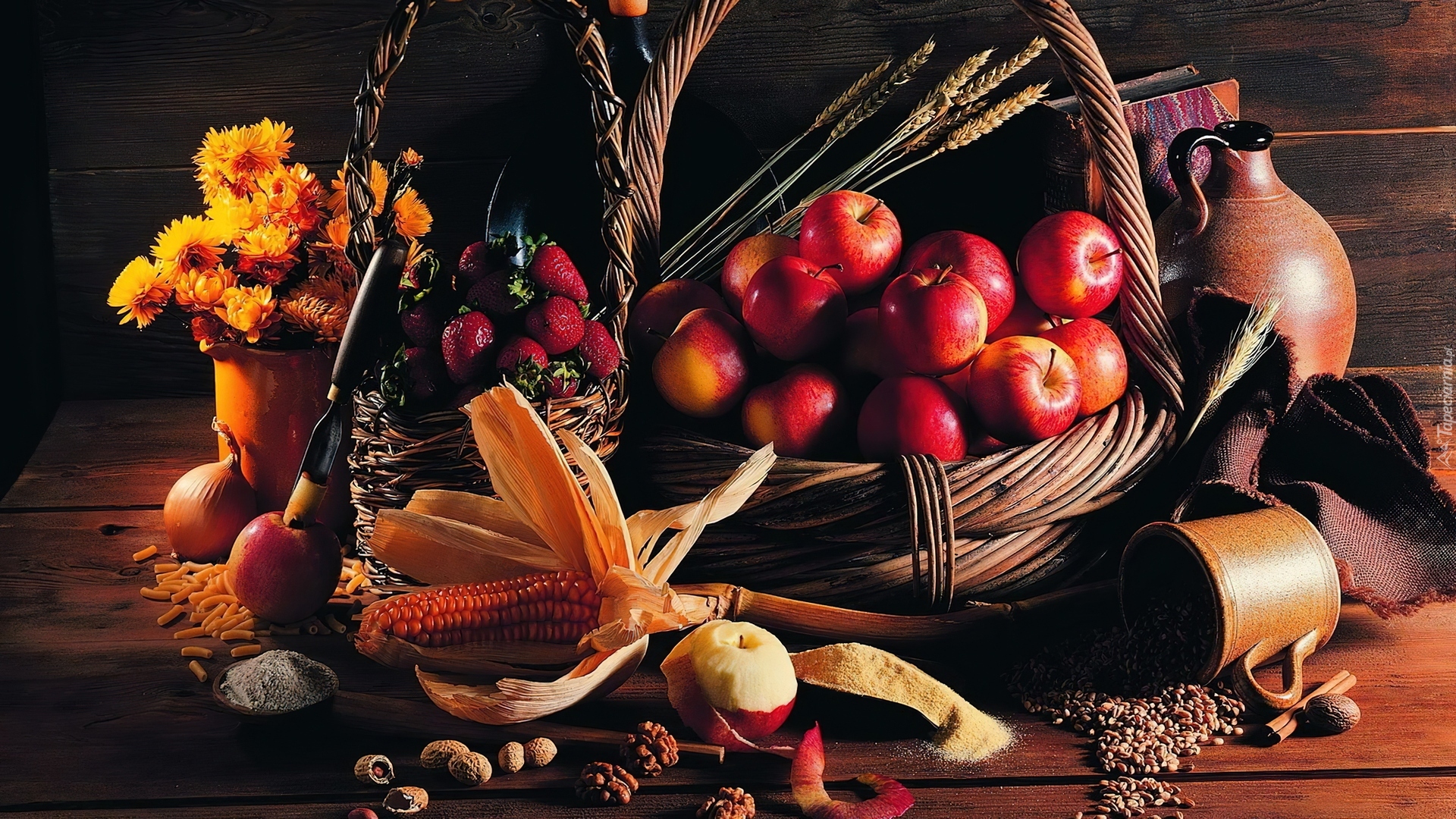 Edytor tapety: Koszyk, Suszki, Jabłka, Kubek