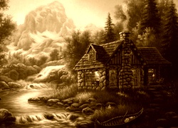Edytor tapety: Domek, Kaskady, Wody, Drzewa, Góry, Kamienie