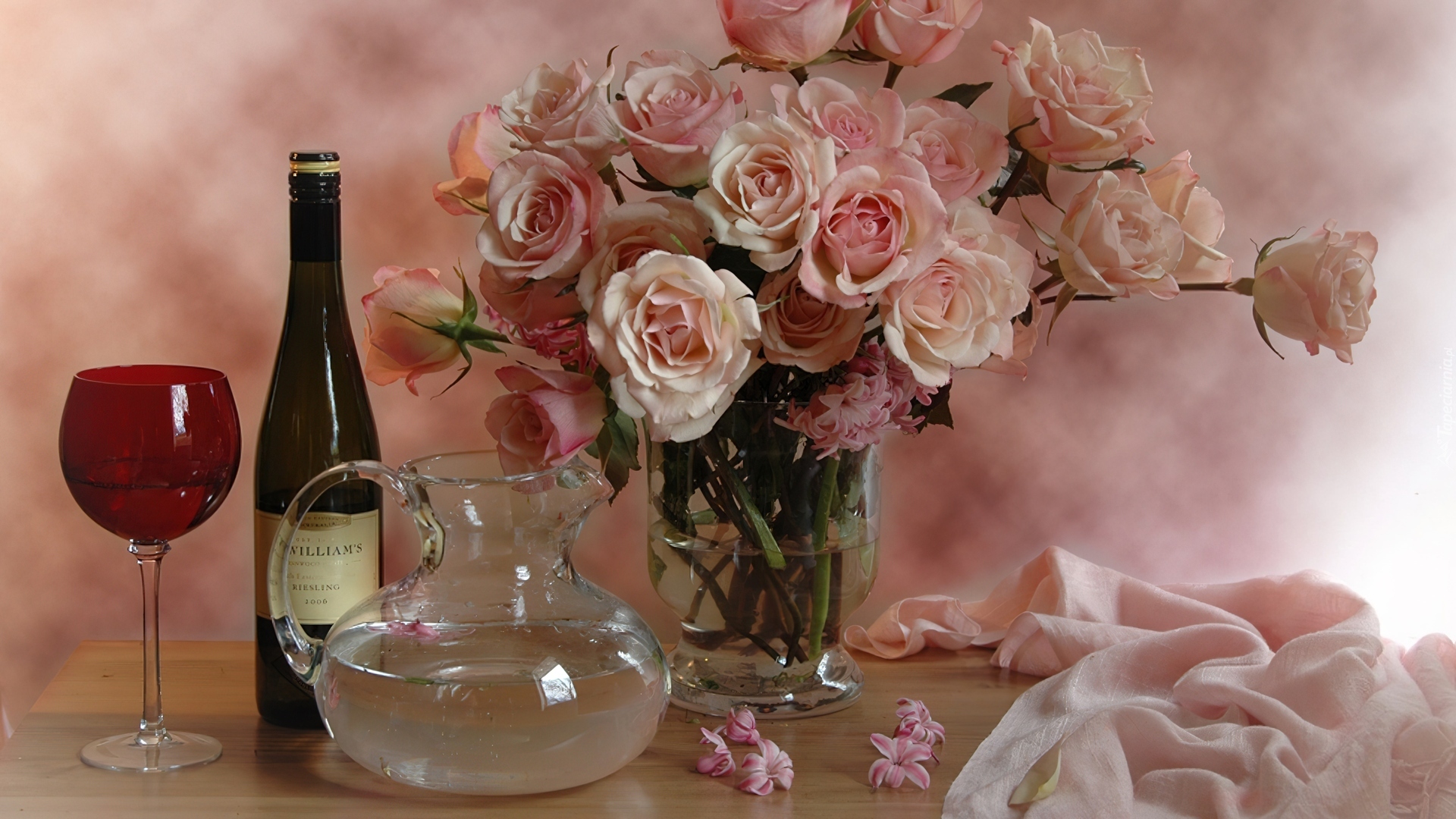 Edytor tapety: Różowe, Róże, Szklany, Dzbanek, Kieliszek, Wino