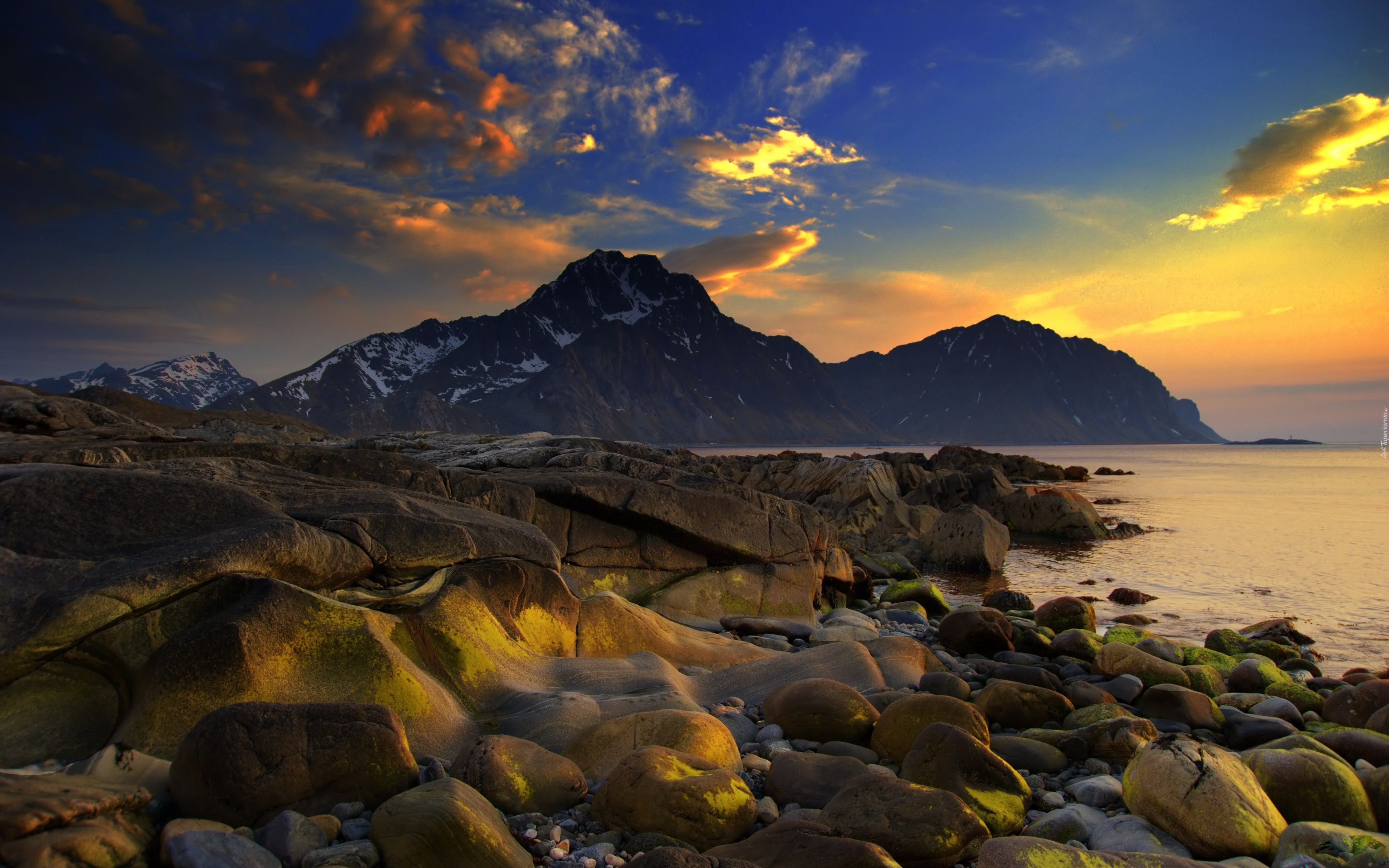 Edytor tapety: Zachód, Słońca, Skały, Kamienisty, Brzeg