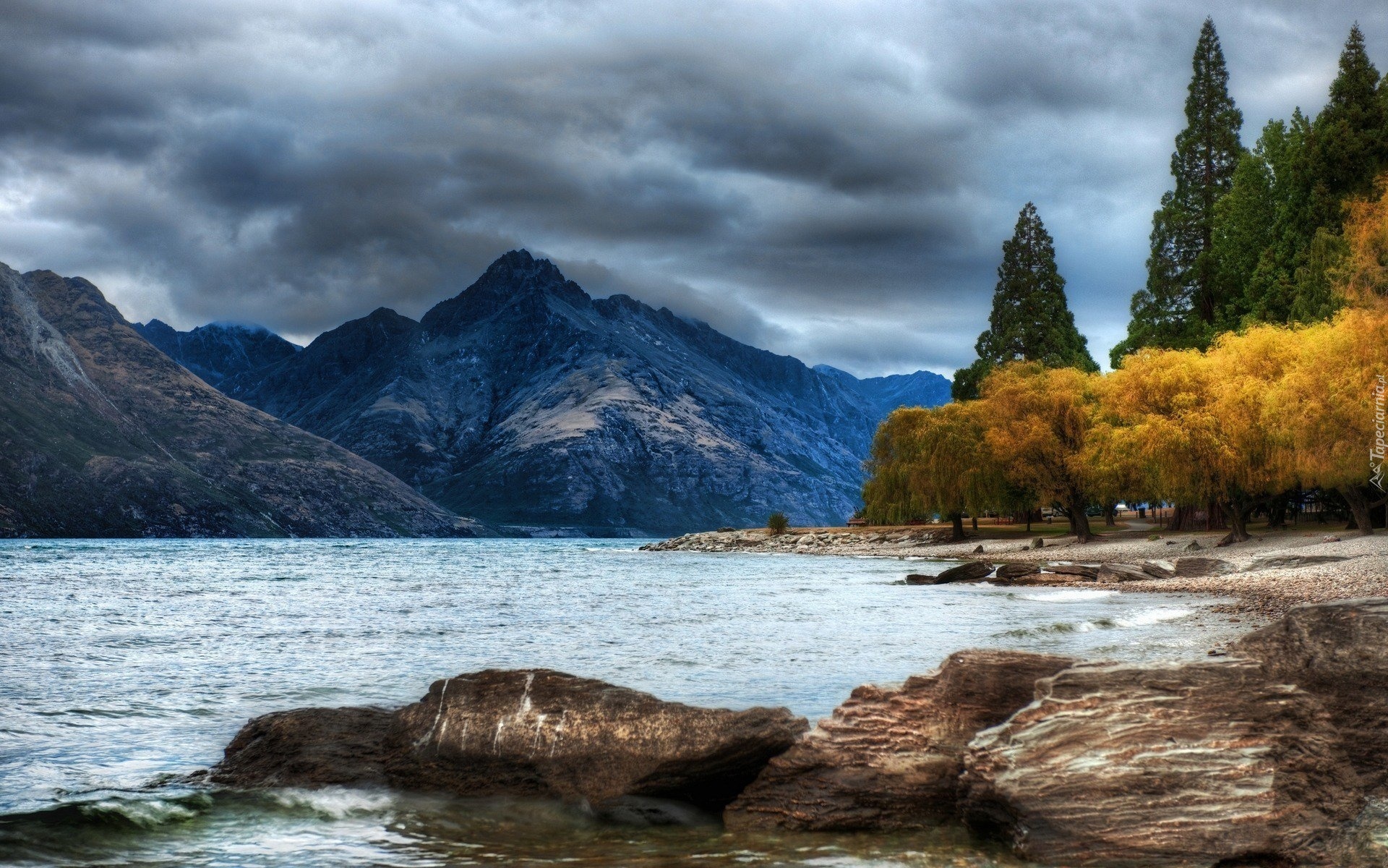 Edytor tapety: Chmury, Las, Rzeka, Skały