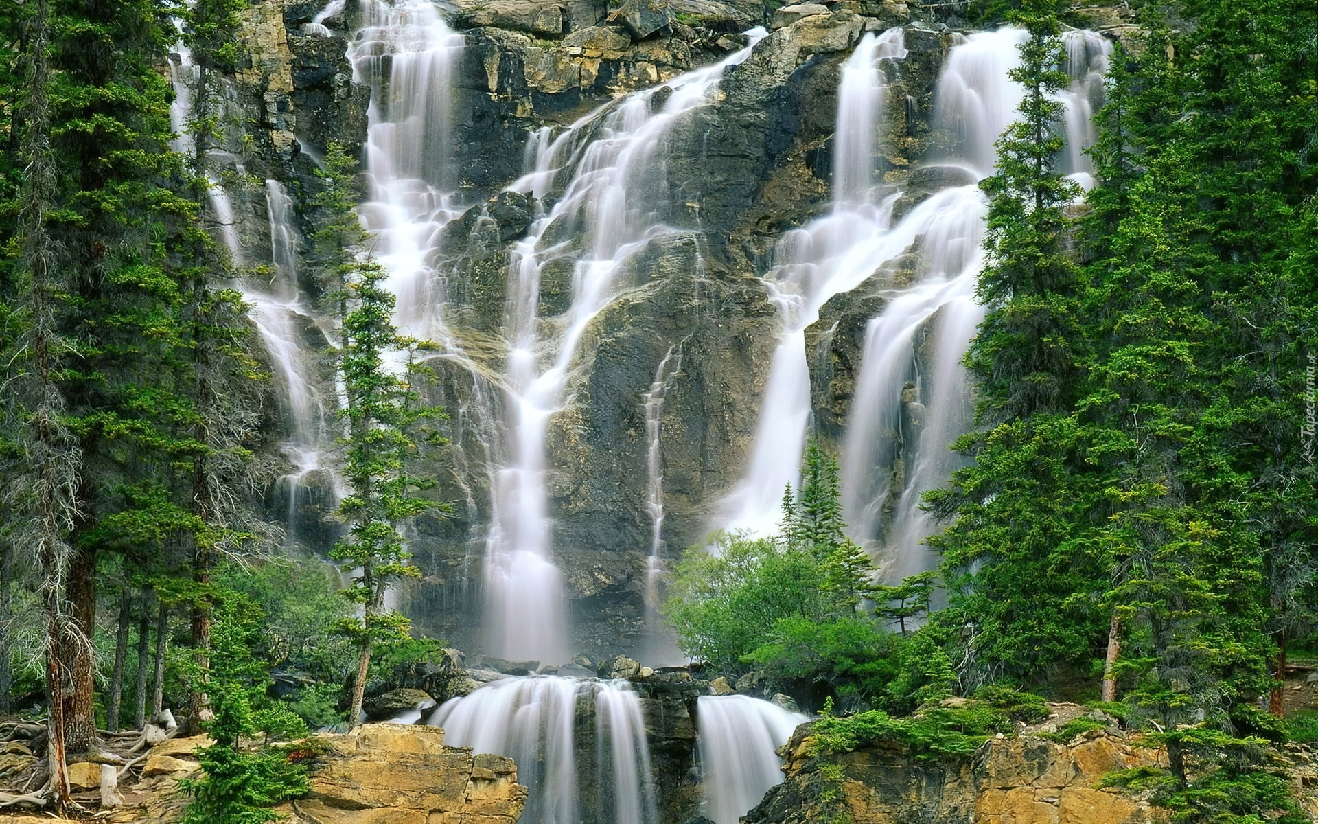 Edytor tapety: Wodospady, Drzewa, Iglaste